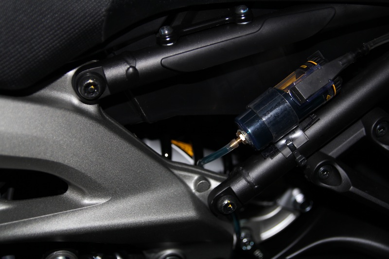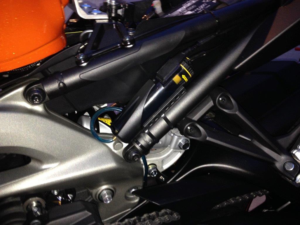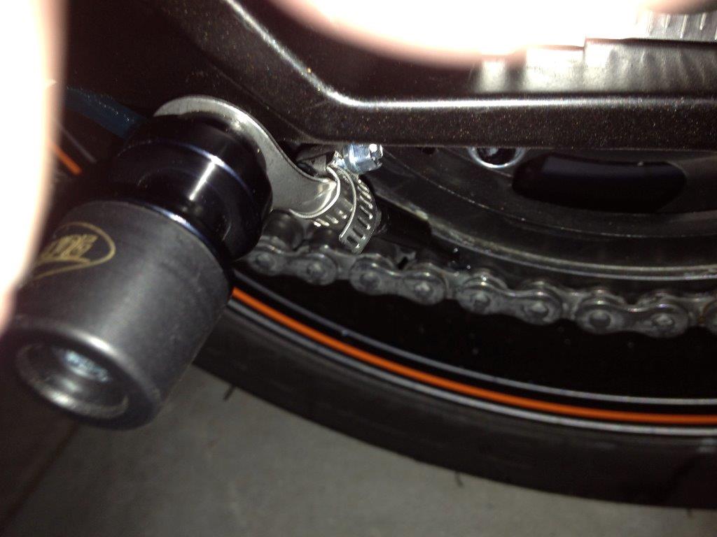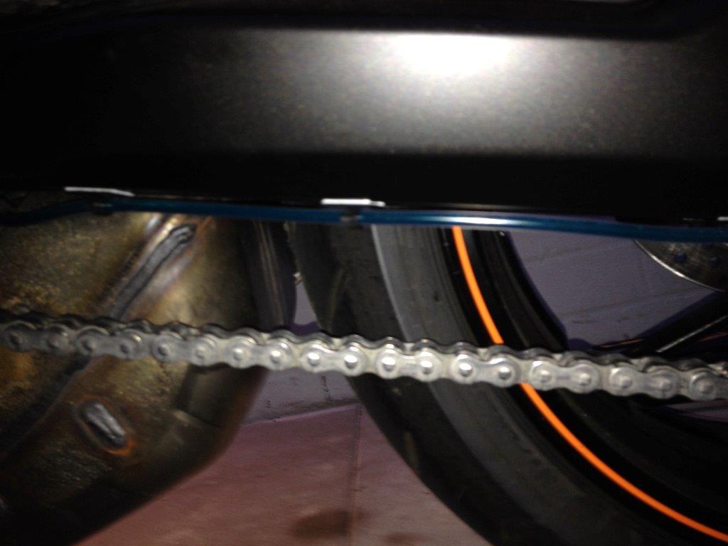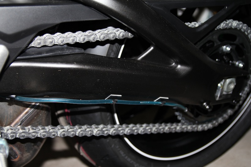 Ich habe die Austrittsdüse hinten ans Kettenrad geführt, damit ich das im Auge behalten kann. Was bei der Ritzelschmierung nicht so gut geht.
