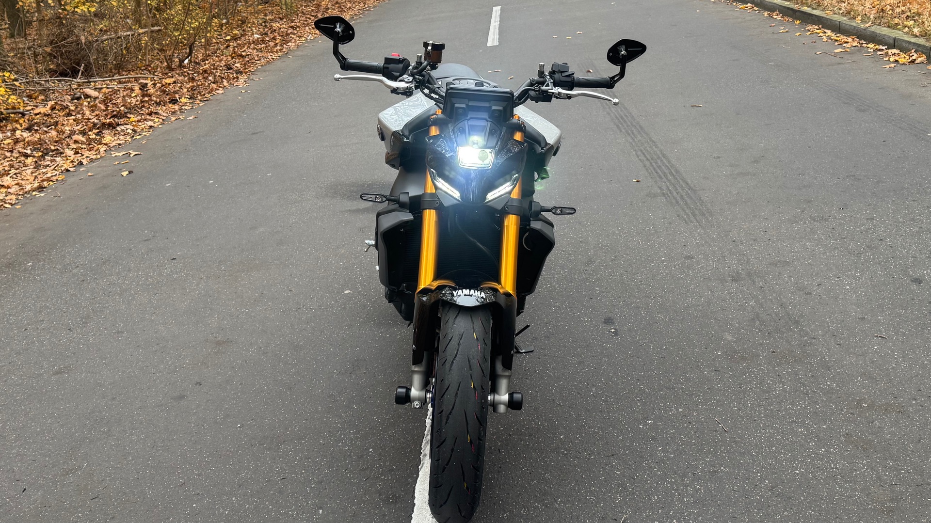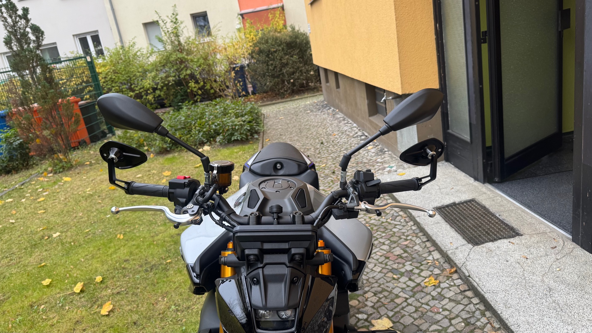 Meine Spiegel kann man zwar nicht seitlich verstellen aber ich kann mir auch nicht vorstellen, dass das einen Unterschied machen würde. Hier mal ein Foto von meiner Sicht. Bei vollem Lenkeinschlag ist noch 1cm Platz zu Tank. Also, wenn dann geht nur nach außen zu stellen, aber die paar cm ändern sicher auch nichts. Werd die Spiegel dann wohl nach oben drehen müssen.