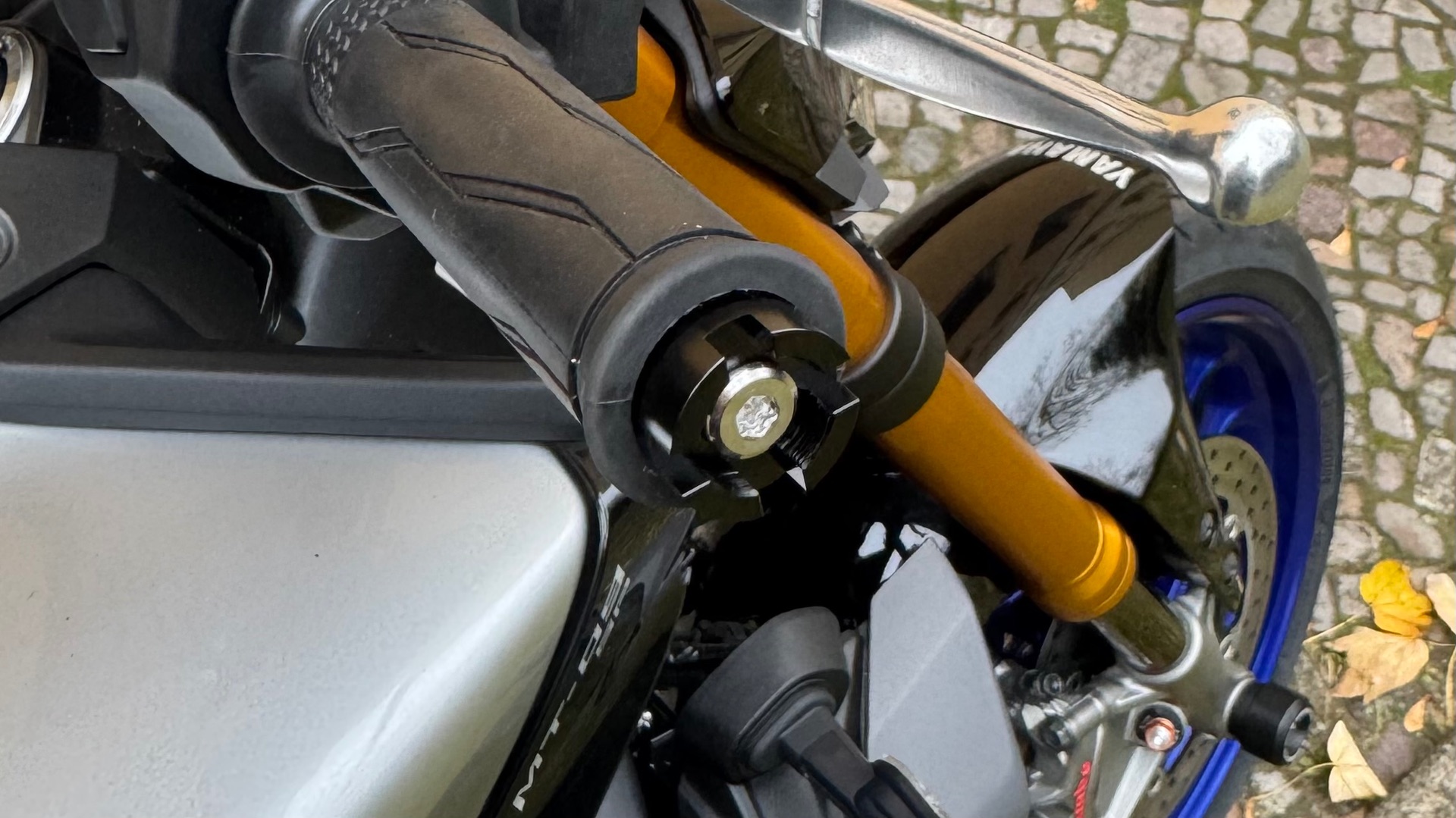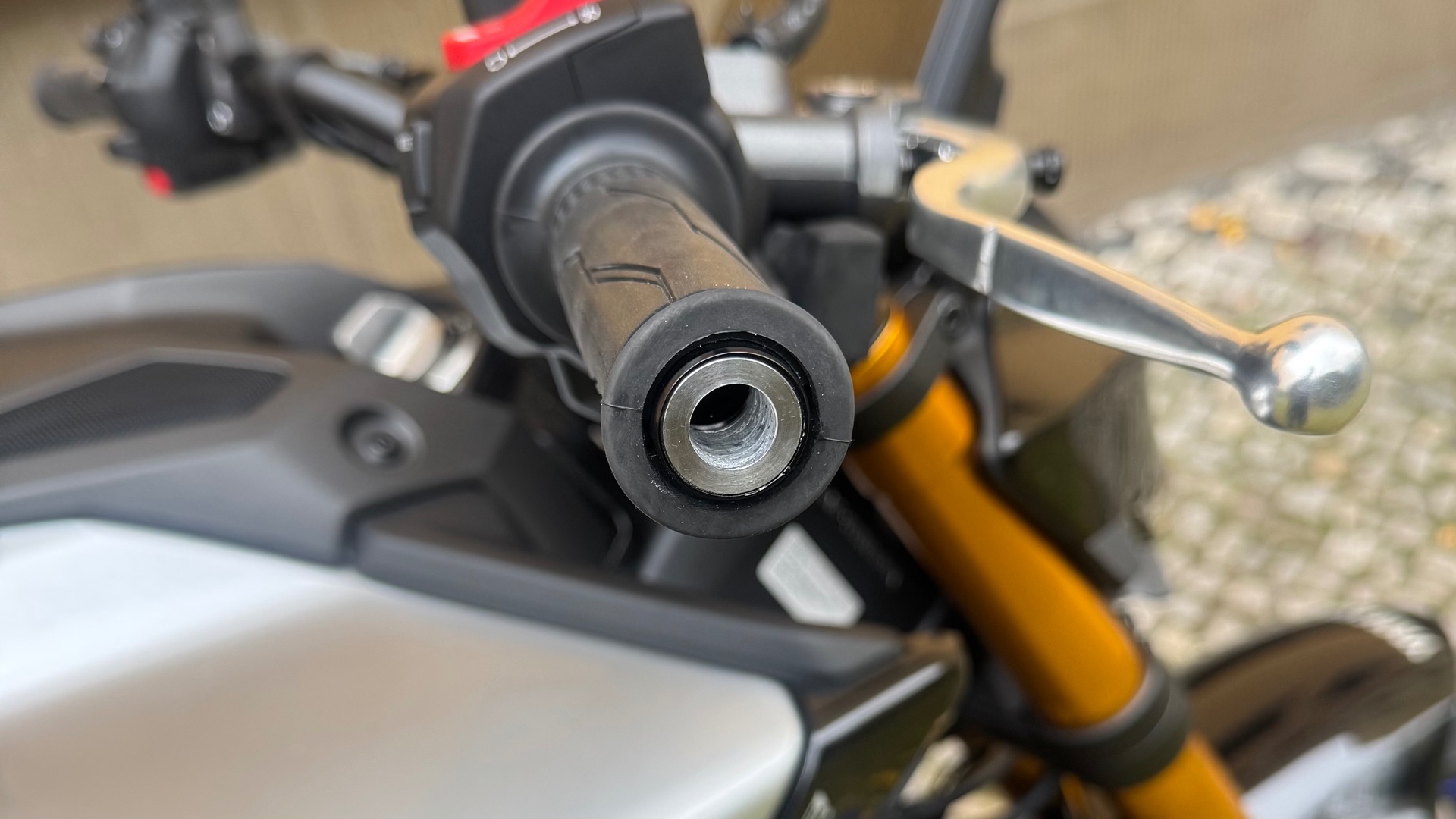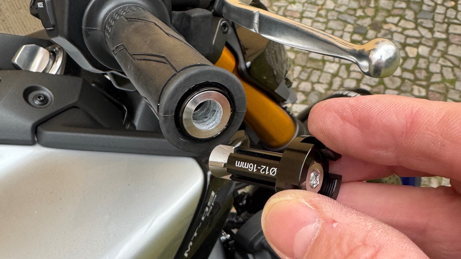 #280 Angebaut habe ich die Spiegel, in dem ich einfach das Gewinde im Lenker auf 12 mm aufgebohrt habe und die Motogadget Adapter benutzt habe, die dann perfekt passen und greifen. Später werde ich noch ein M14 Gewinde hineinschneiden. Dann greifen die Adapter immer noch perfekt und ich könnte mit Gewindereduzier-Hülsen wieder runter auf M8 um die Originallenkerenden einzuschreiben.