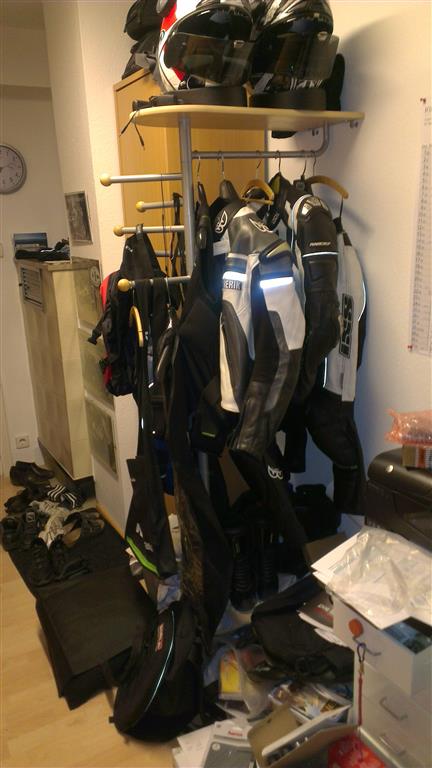 Ich nütze eine alte Garderobe für die Lederkombis, Stiefel und die Helme.
