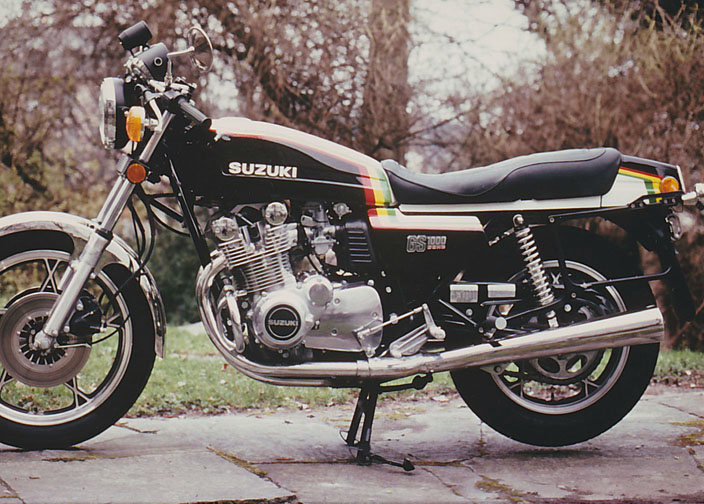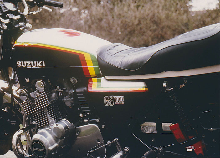 Anno 1978 wollten mir die Farben der Suzuki GS1000 gar nicht gefallen. Da habe ich mir ein eigenes Design gezeichnet und einen Azubi eines Spritzwerkes dazu ermuntert, mir das zu realisieren. Dann habe ich beim Händler den Tank. das Heck und die Seitenteile abgeholt, ohne dass die Maschine einen Meter gelaufen ist.