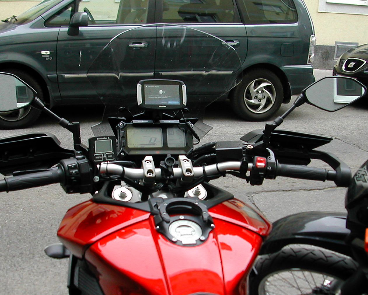 #135 Für mich passt es so am besten und das Navi ist immer im Blickfeld. Die Scheibe lässt noch einiges an Verstellwinkel des Navi nach oben und unten zu. Unter der Instrumentenkombi geht nicht, da sind die Kabel der rechten Lenkeramaturen im Weg. Am Lenker hab ich nur eine Givi Halterung für Notfälle (bis ich dem neuen TomTom rider vertraute, dauerte das etwas und ich hatte immer ein altes Autonavi als Backup dabei). Die Montage am Lenker ist aber nicht optimal. Mit montierten Tankrucksack sieht man das Navi nicht mehr und ohne Tankrucksack muss ich mich extra runterbücken, um es gut ablesen zu können. Montiert hat es der Freundliche.
