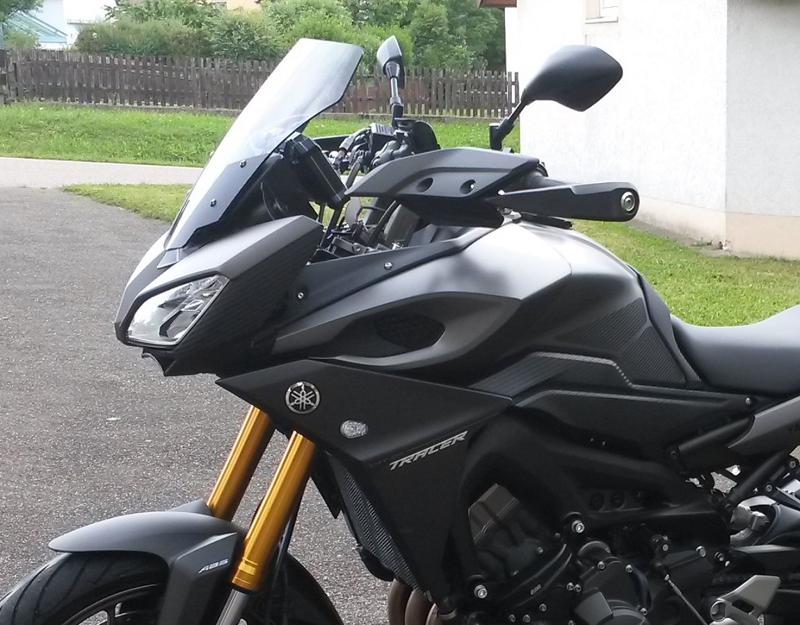 Ich werde die Scheibe daher noch einmal um ca. 2 cm einkürzen, dann sollte das passen. Auf der Autobahn muss man sich dann zum Rasen allerdings stark hinter die Scheibe ducken, oder es geht mächtig auf die Nackenmuskulatur. Ein Optimimum aus Fahrgeräusch und Entlastung des Kopfes bei hohen Geschwindigkeiten, gibt es aus meiner Sicht nicht. Es sei denn, man verwandelt seine Tracer mit der riesigen Puig Tourenscheibe in einen Kabinenroller, aber das ist für mich gar keine Option.