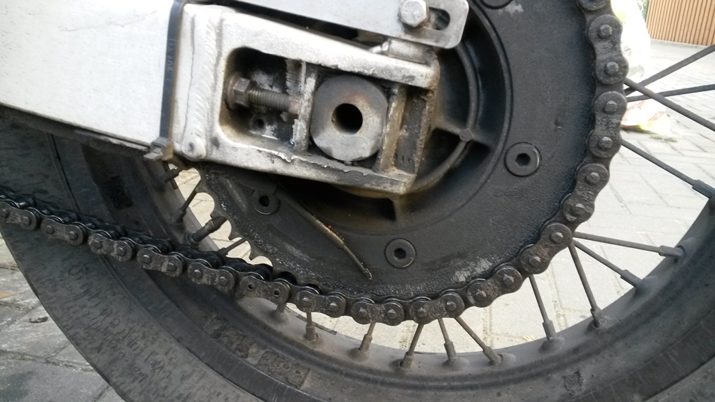 Wie gesagt, das sind meine erfahrungen. liegt aber vielleicht auch zum teil mit daran, daß mir das wetter einfach egal ist und ich täglich mit dem alten teil wenigstens 60km fahre, also bekommt die kette auch jede menge wasser und salz ab. jedenfalls sieht sie z.z. nach 25000km nahe am ende ihrer lebensdauer so aus: , noch mehr ol fließen zu lassen, verbiete sich, wie die reifenflanke deutlich zeigt.