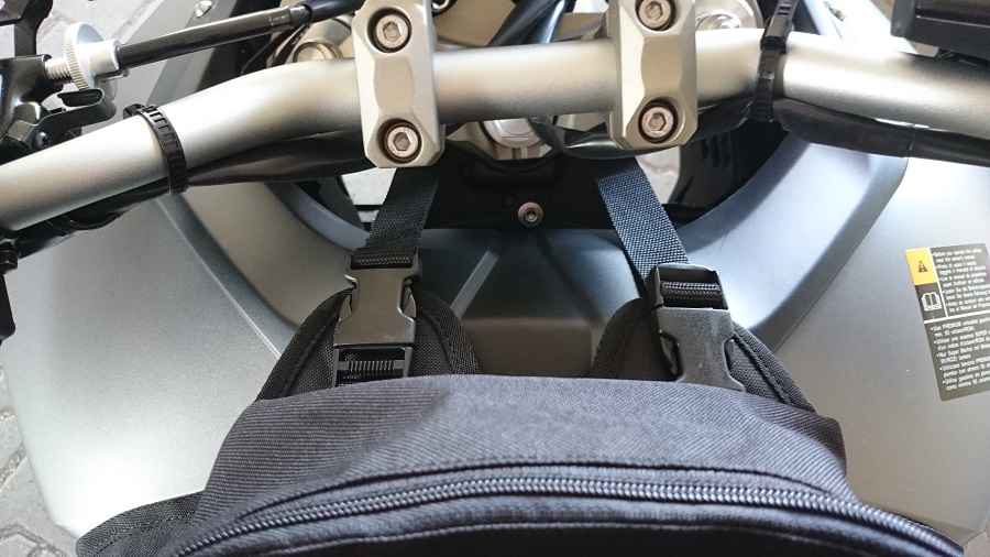 Die Funktion ist aber unschlagbar: Riemchen ziehen Tankrucksack ab, genauso leicht wieder drauf.