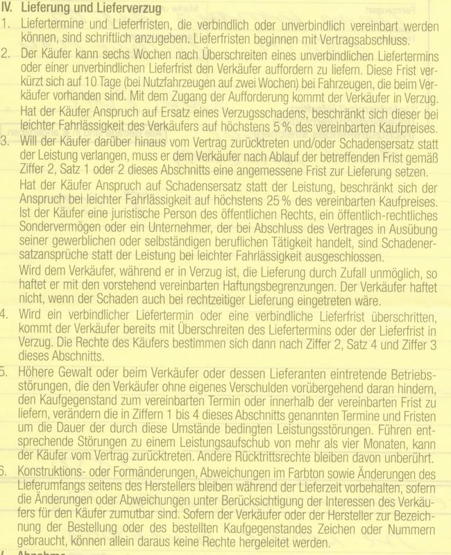 Danke für den Auszug Reverent, also doch mit einer etwas längeren Frist. Ich habe mal gerade in meine Bestellung geschaut und einen solchen Paragraphen gibt es nicht. Ist sehr kurz gehalten. Ich werde einfach mal hingehen und nachfragen.