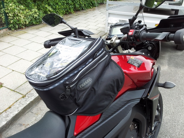 Habe den Moto Detail Tankrucksack von Louis noch von meiner FZ6. War anfangs skeptisch ob der passt. Allerdings haben alle Magnete einen guten Sitz am Tank, so dass man auch ohne zusätzliche Halterung auskommt, vorausgesetzt man überladet den Rucksack nicht, oder fährt an der Limitgrenze. Dazu kann man mit zwei Spanngurten den Rucksack leicht befestigen, was zu einer stabilen Haltung führt.