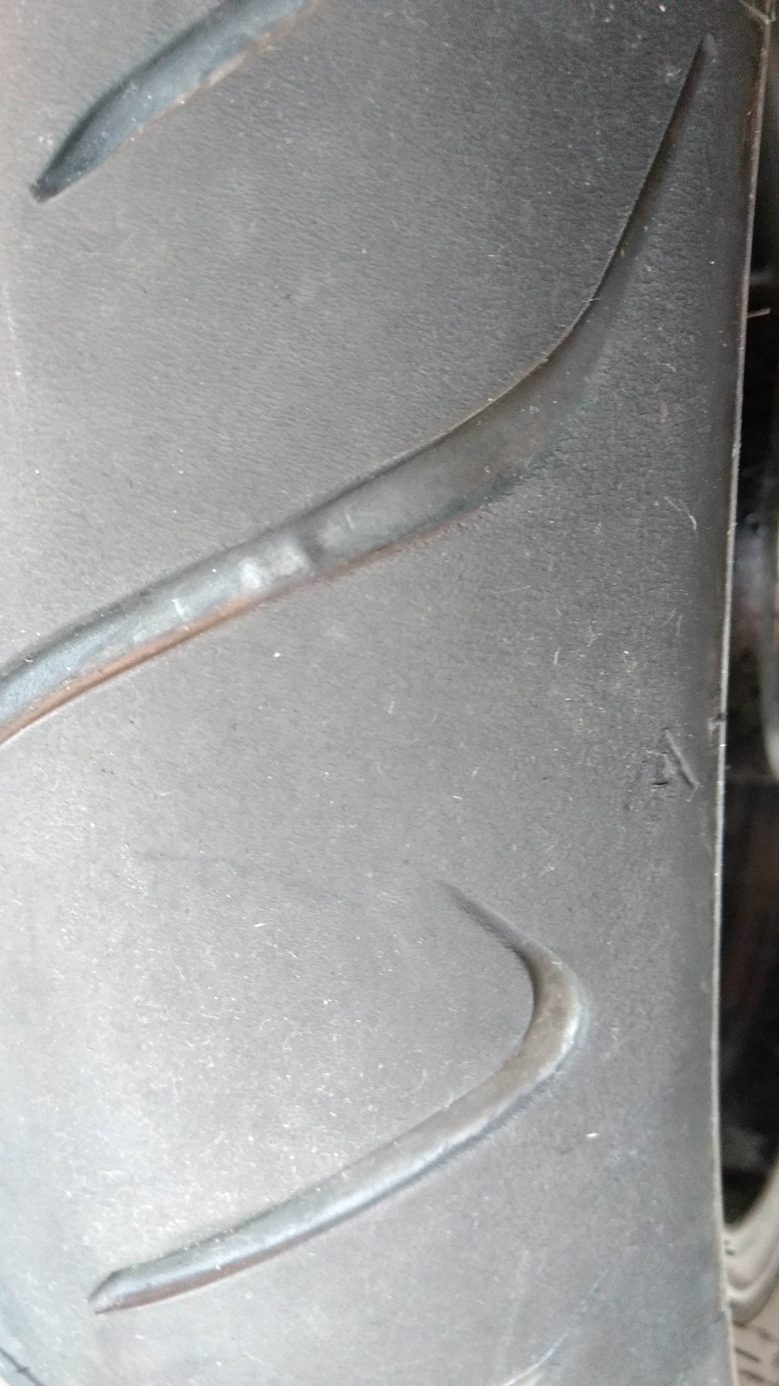Der Vorderreifen hatte an den Flanken ein Restprofil von 0,0 (anfänglich 3,5) und in der Mitte 2,3 von 4,0 mm.