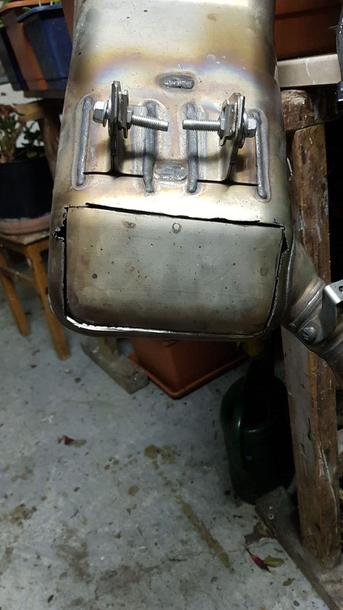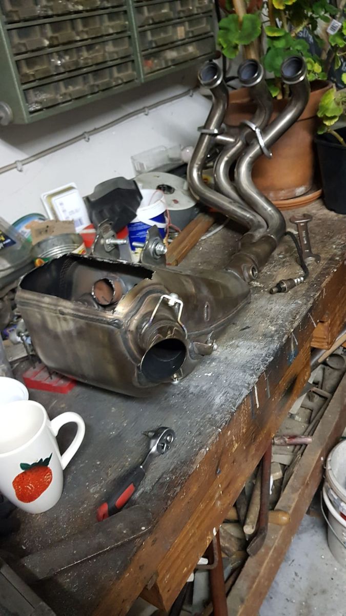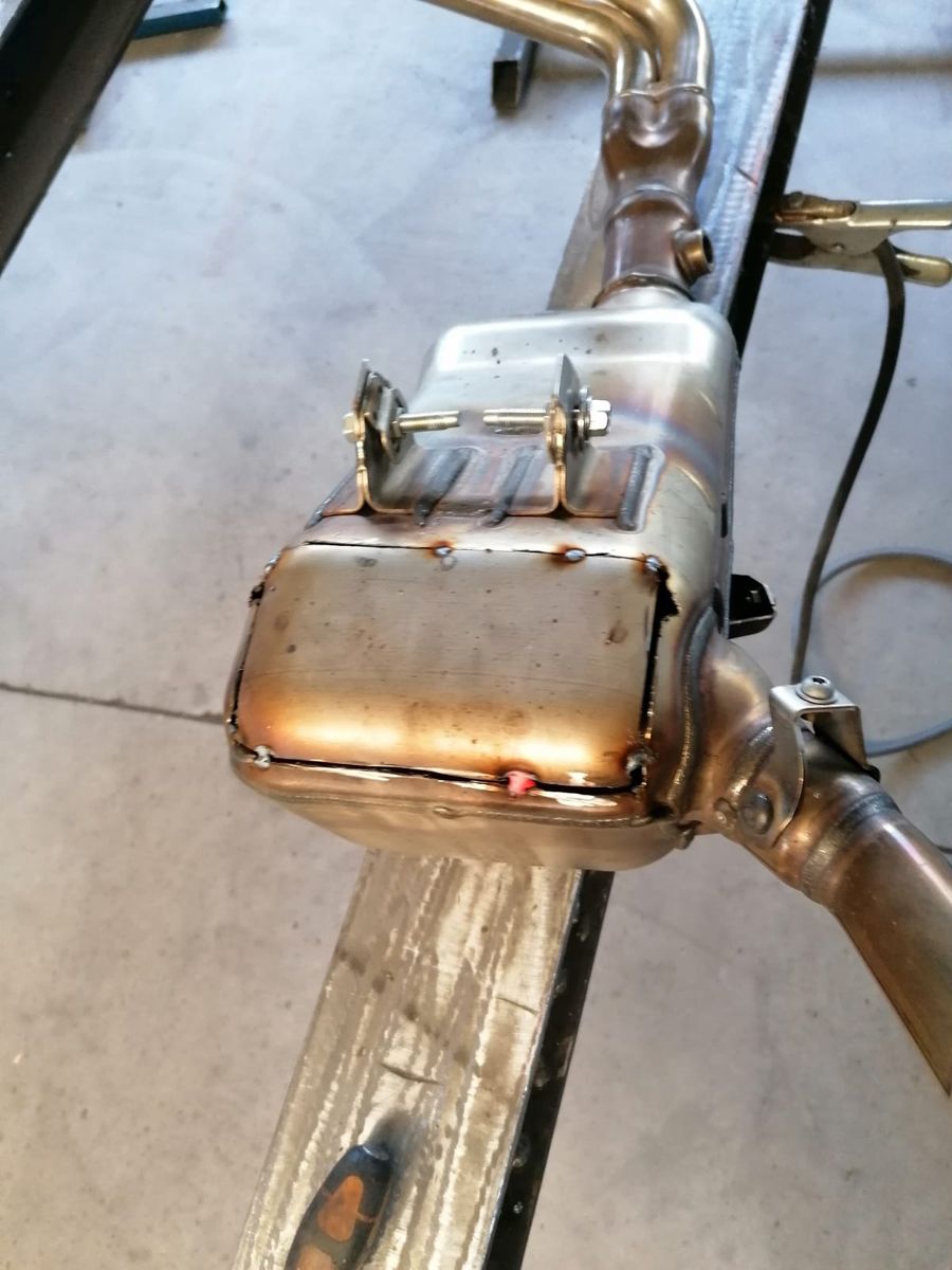zumindest habe ich jetzt schon mal ein Bild vom Auspuff, nach dem Schweißen und vor dem Schleifen. Kann man wenigstens schon mal sehen, wie dick ein 3" Endrohr ist.