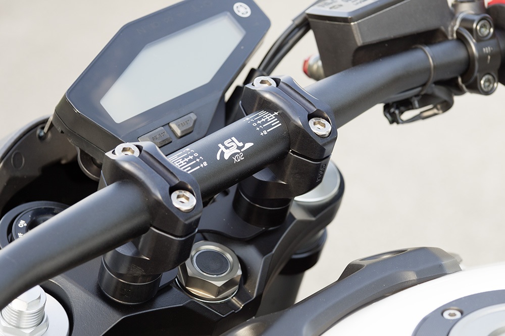 Diese Klemmböcke gibt es in der HOHEN Variante, wie auf den Fotos zu sehen, oder in einer flacheren Variante, ohne 15 mm Distanzbuchsen unter den Klemmböcken. Welche Klemmböcke Sie benötigen, hängt von der Höhe des Lenkers ab, den Sie verwenden möchten.