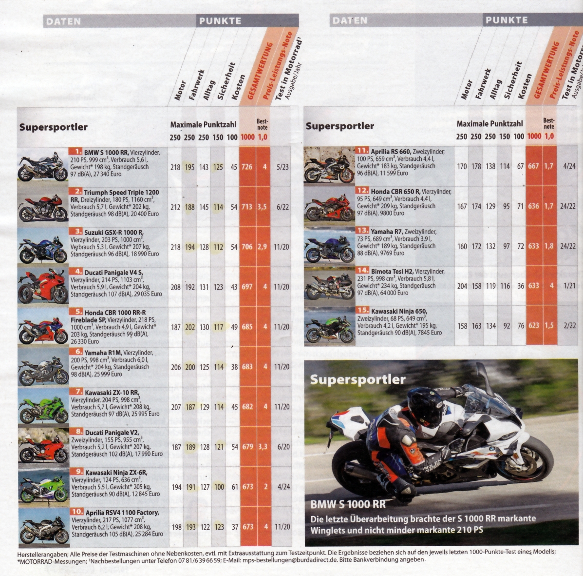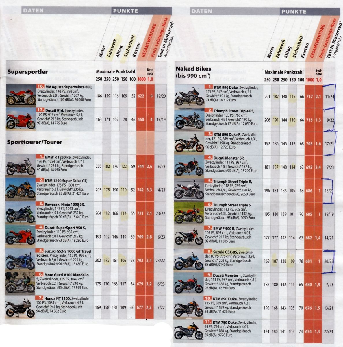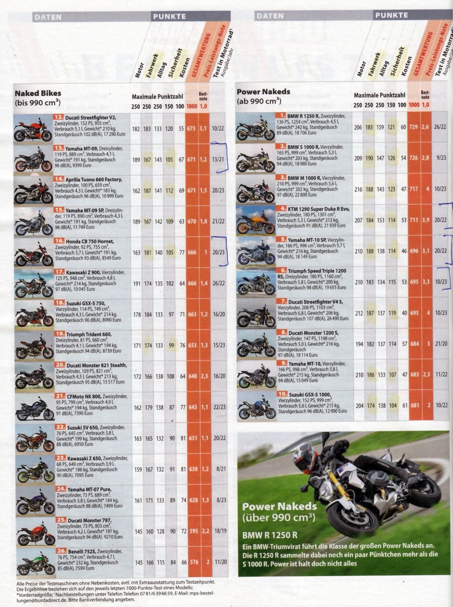 Was auch immer von den „Motorrad“ Bewertungen zu halten ist, geben sie doch die relativen Unterschiede zwischen den Bikes wider.