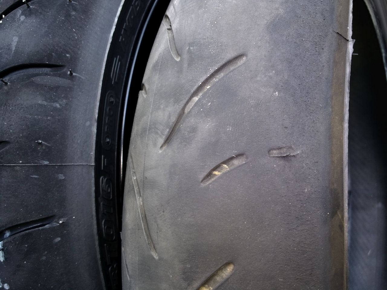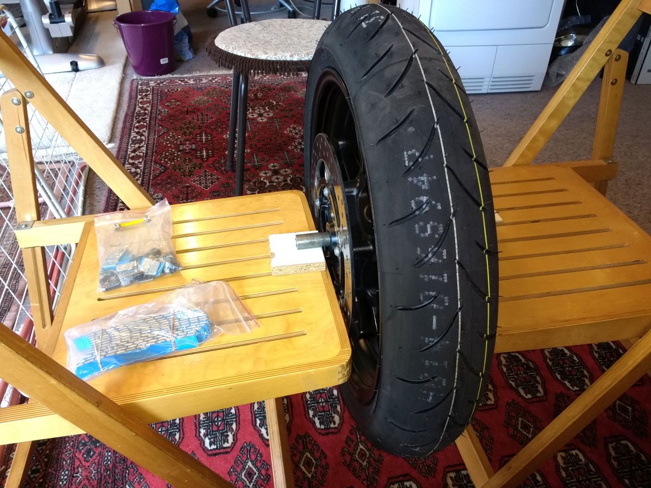 Zum Auswuchten nehme ich zwei Stühle und die originale Steckachse. Damit die Lagerreibung nichts ausmacht drehe ich die Achse beim Auspendeln leicht vor- und zurück. Klebegewichte zu 5g gibt's im 10er Riegel. Die letzten beiden Bridgestone BT 016 pro waren so genau gefertigt, dass ich an den Gewichten nicht ändern musste.