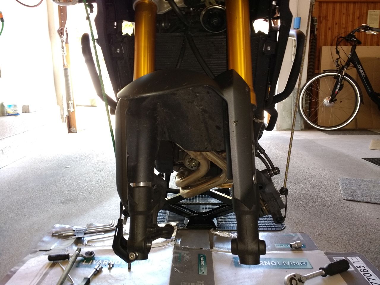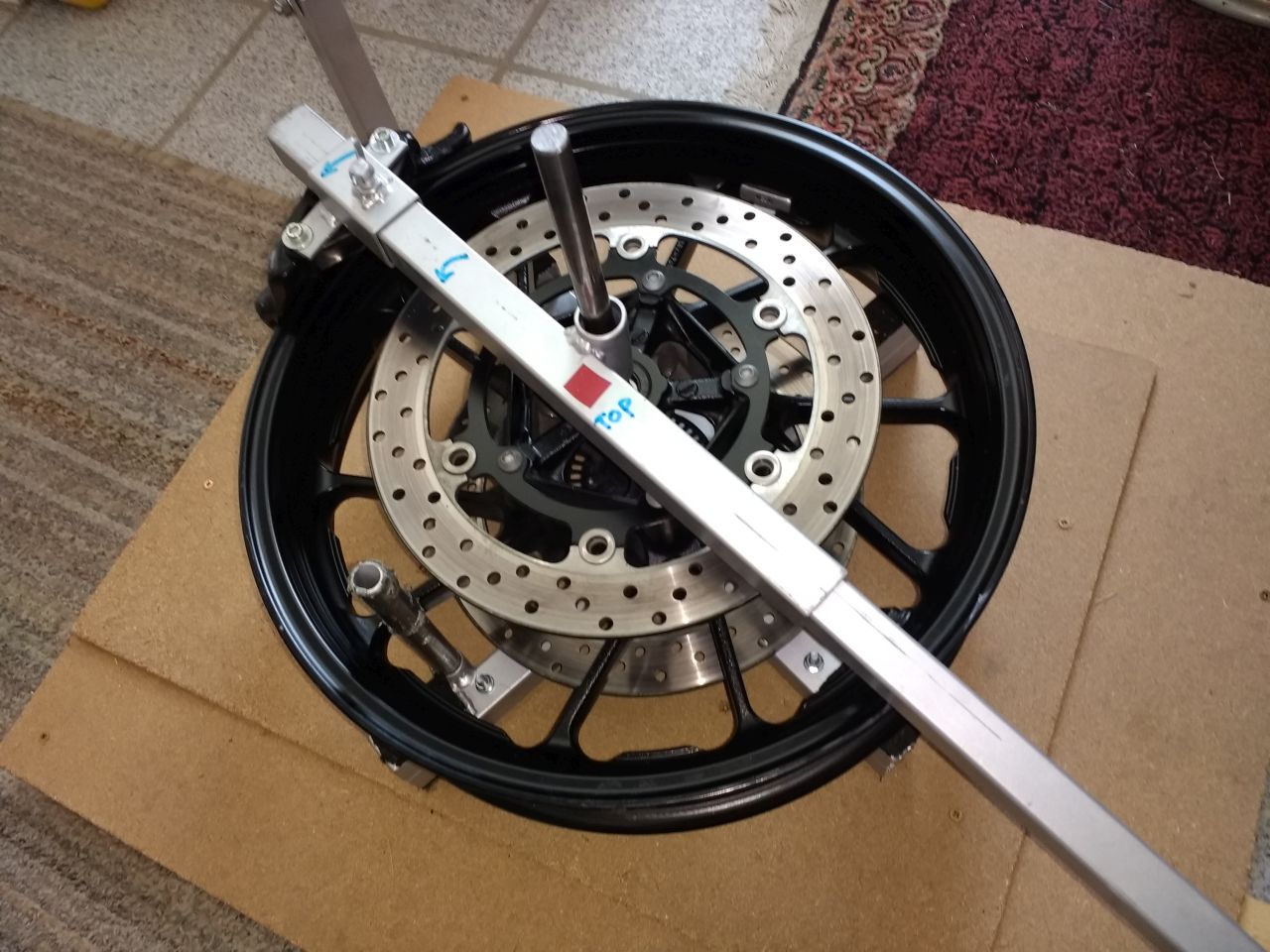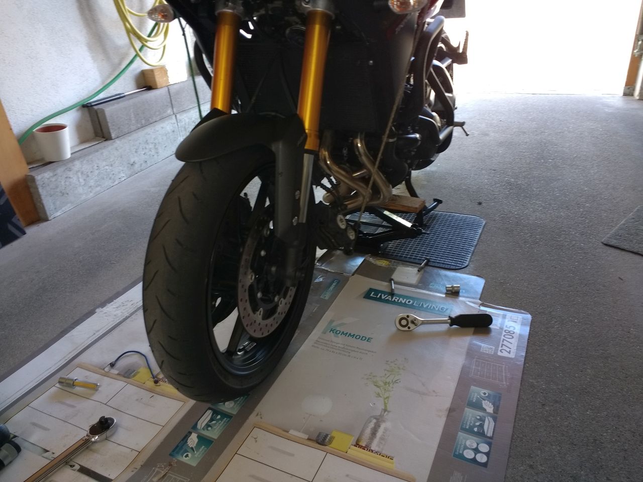Bei meinem früheren Motorrad hatte ich hinten wie vorn den gleichen Achsdurchmesser (20 mm). Bei der MT09 (auch Tracer) gibt es hinten eine 20 mm Achse, aber die vordere misst 17 mm. Daher musste ich für mein Montiergerät erst mal eine weitere Achse besorgen. Als "Silberstahl" gibt es 17 mm Achsen, habe die aber nur mit Toleranz h9 gefunden. Damit hat man im Grenzfall kein Spiel sondern Presspassung. Deswegen habe ich eine 16 mm Achse gekauft. Besser wäre es, die 17 mm Achse auf einer Drehbank anzupassen, habe aber leider keine Drehbank zur Verfügung. Damit die Arbeit nicht zu einer schweisstreibenden Angelegenheit ausartet, sucht man sich einen sonnigen Tag aus und stellt altes Rad wie auch neuen Gummi eine halbe Stunde in die pralle Sonne. Dabei 2-3 mal wenden. Die Gummis werden dadurch warm und viel weicher und lassen sich leichter montieren. Der Hinterradreifen lässt sich wegen seiner Breite einfacher draufziehen. Anfänger sollten zum Lernen damit beginnen. Ich beschreibe hier aber das Vorderrad.Als erstes entlastet man das Vorderrad, z.B. mit einem Scherenwagenheber unter der Ölwanne. Dabei ein Weichholz zur Druckverteilung unterlegen. Geht nur bei der Tracer mit Hauptstäder. Die anderen brauchen 2 Motorradheber (z.B. Ricambi Weiss) vorn wie hinten. Die Bremssättel hängt man an Gummispannern auf. Abdeckung für ABS Sensor sowie den Sensor selbst habe ich entfernt, damit da nichts beschädigt wird. Damit man das Rad aus dem Kotflügel rauskriegt, muss man zum Schluss den Wagenheber etwas höher drehen.