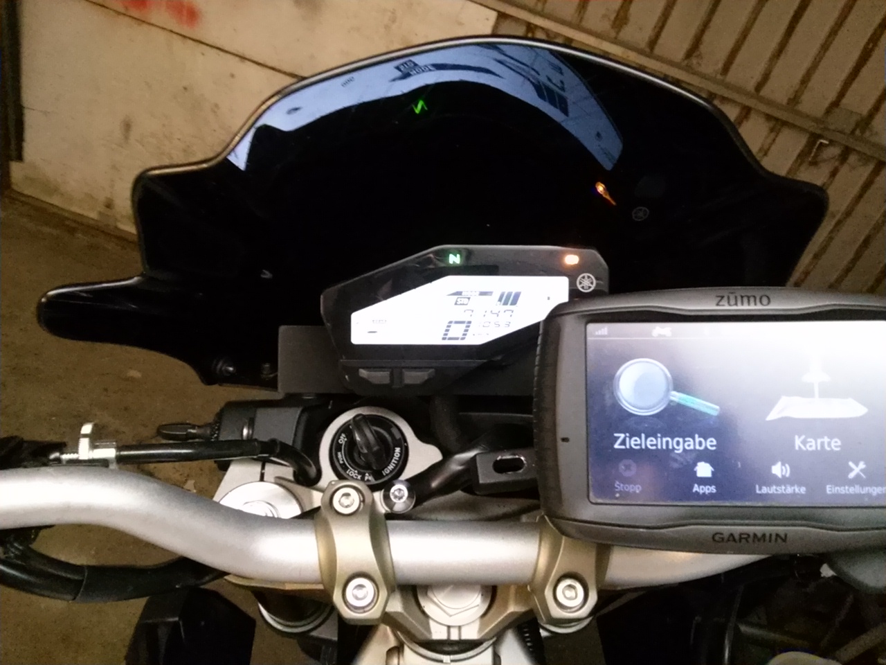 Einen Aluwinkel mit den oberen Schrauben der Windschildhalterung verschraubt und den Halter an den Winkel montiert, daneben ist noch Platz für eine 12v Steckdose