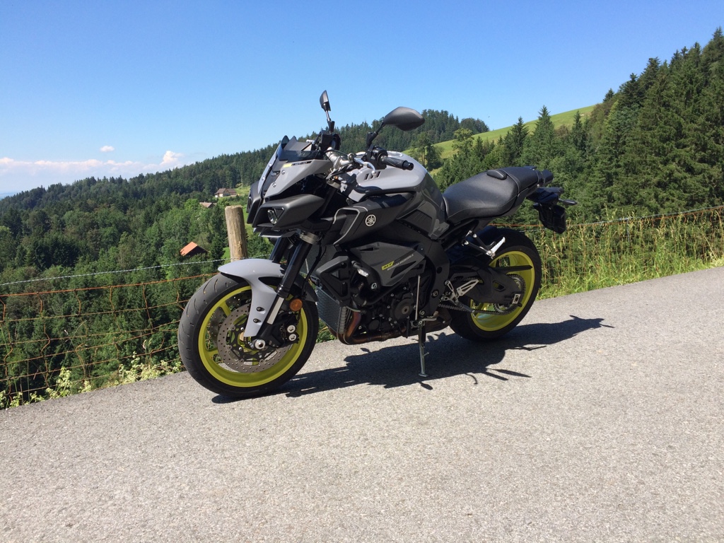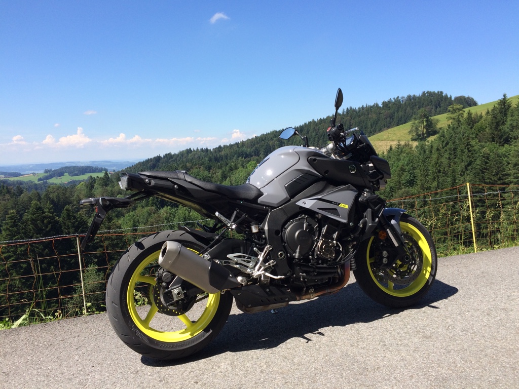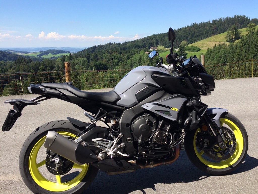 Die MT 10 ist ein erwachsenes Bike in der 1000er, 4 Zylinder Klasse. Man spürt sofort, dass man mehr in der Hand hat als auf der MT 09. Das heisst aber auch dass man mehr Gewicht herunterbresmsen muss. Das Bike ist absolut spurtreu, es führt dich dorthin wo du es führst und ist überhaubt nicht "kippelig". Der Sound der das Bike hergibt ist absolut Hammer, ich hatte das Gefühl, ich sitze auf einem V4 Motorrad! Das brummt richtig geil (das vermisse ich auf der MT 09 etwas).