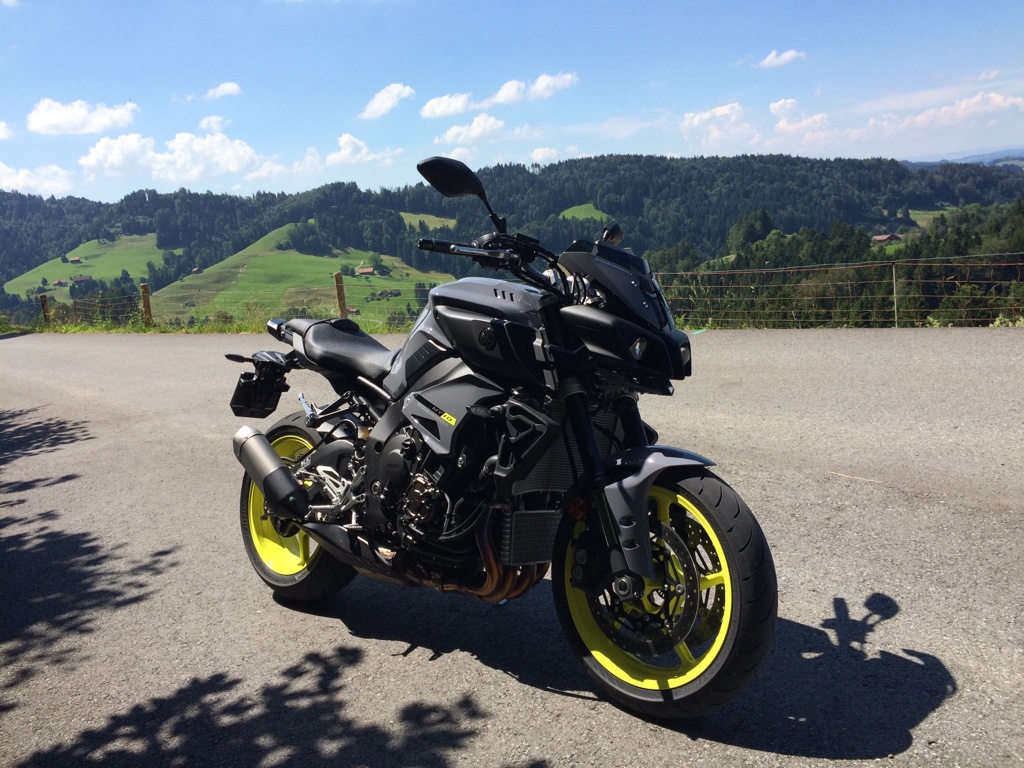 Die MT 10 ist ein erwachsenes Bike in der 1000er, 4 Zylinder Klasse. Man spürt sofort, dass man mehr in der Hand hat als auf der MT 09. Das heisst aber auch dass man mehr Gewicht herunterbresmsen muss. Das Bike ist absolut spurtreu, es führt dich dorthin wo du es führst und ist überhaubt nicht "kippelig". Der Sound der das Bike hergibt ist absolut Hammer, ich hatte das Gefühl, ich sitze auf einem V4 Motorrad! Das brummt richtig geil (das vermisse ich auf der MT 09 etwas).