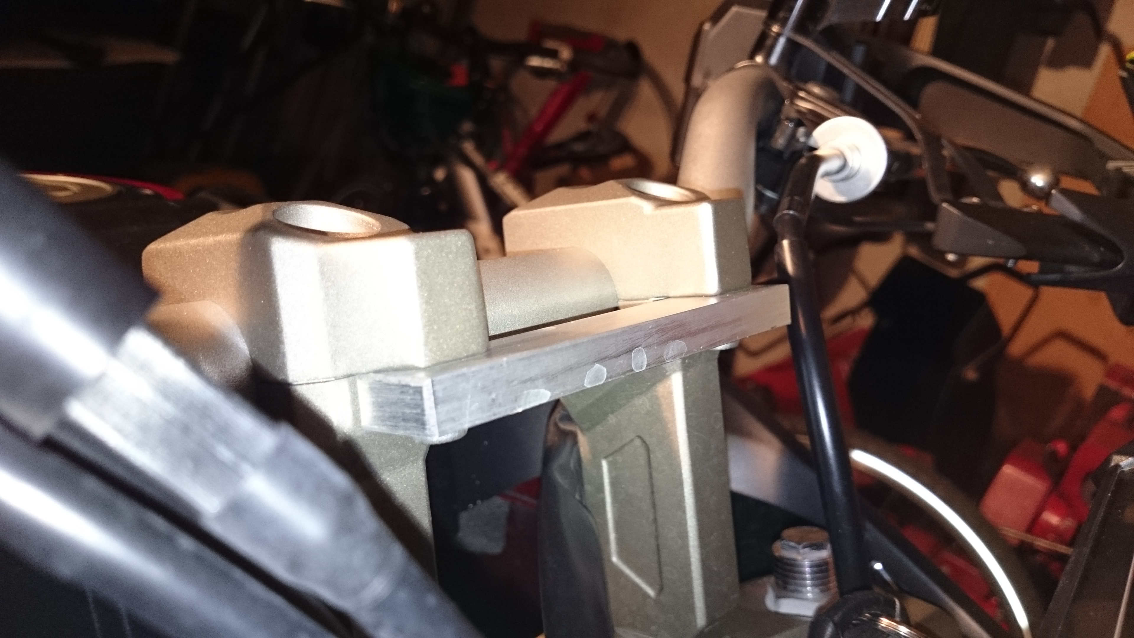 An den Fortsätzen oben hat es unten zwei Gewindeaufnahmen. Da kann man etwas anschrauben. Wurde von Yamaha extra gemacht, damit Navis etc. angebracht werden können.