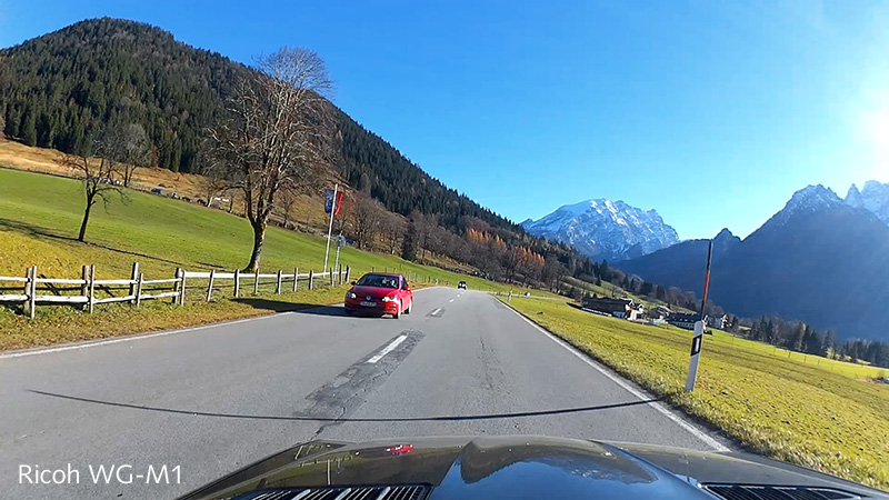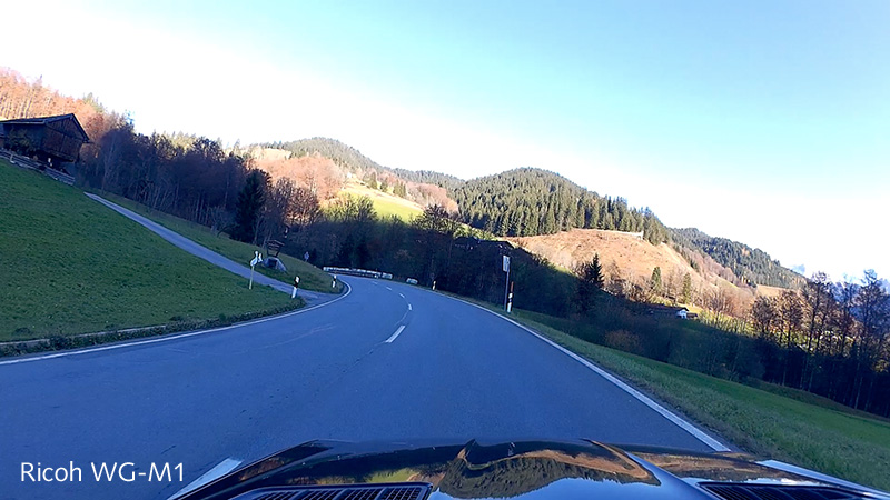 Nachtrag und Fazit zur Ricoh WG-M1: Die Ricoh ist in etwa auf dem Level der SJ4000 (siehe weiter vorne im Thread), liefert jedoch sattere Farben. In der Schärfe und im Kontrast sind beide auf Augenhöhe (beide liefern 30 fps / 1920 x 1080p). Der Bildstabilisator der Ricoh arbeitet ganz gut und den Verwacklungen durch Fahrbahnunebenheiten hat sie recht souverän entgegengewirkt. Technisch ist die Ricoh dennoch kein Meisterwerk, wenn man von den innovativen Lösungen absieht: 1-Gehäusekonzept (wasserfestes Gehäuse bis 10 m Tiefe stabil gegen Druck), bessere Stoßfestigkeit (auch dank CNC-Alugehäuse), sehr guter SmartPh.-App, hochauflösendem kontrastreichen Display, einfacher Menüführung, Stativgewinde, gelungener Tastenbedienung und einem sehr schicken Design.