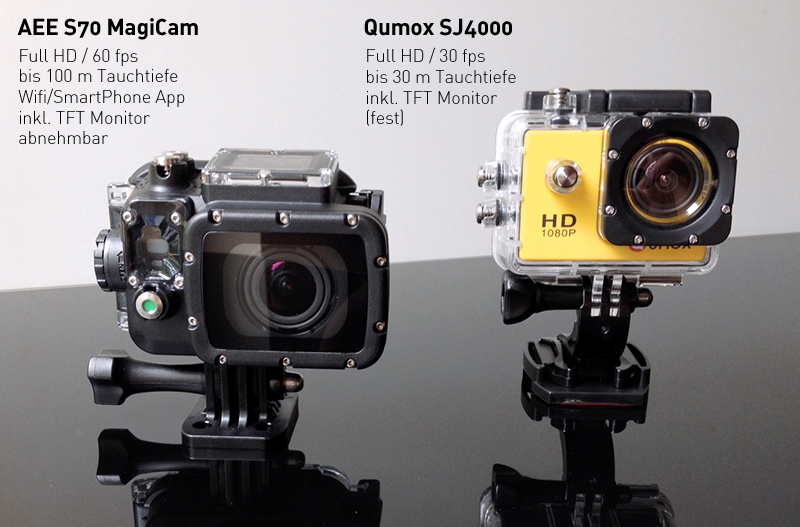 Ich hab mir jetzt noch die Qumox SJ4000 dazugeholt (also zur Panasonic… s.Seite vorher), sozusagen als 2. Kamera für Szenen, wo ich die 4K nicht unbedingt brauche. Hab dazu reichlich Youtube-Filmchen betrachtet und Rezensionen gelesen. Auch einige schlechtere Aufnahmen gezogen und über meine Schnittsoftware testhalber aufgepeppt (was relativ leicht geht). Die Kamera kostet mit ziemlich viel Halterungen soviel, wie die Halterungen allein im GoPro-Zubehör. Sprich 92 Euro. Dazu noch einen Ersatzadapter (8 Euro) und eine 32 GB SD-Karte (14 Euro). Die Kamera liegt etwa qualitativ bei "Hero 3 silver"-Niveau und leistet sicher gute Dienste für Sekundärfilmereien (z.B. als Heckkamera etc.). Als Unterwassercam finde ich sie sogar besser als die GoPro (3). Die macht echt gute Filmchen (Beispiel: http://www.youtube.com/watch?v=QpLVsmSMjrI ).
