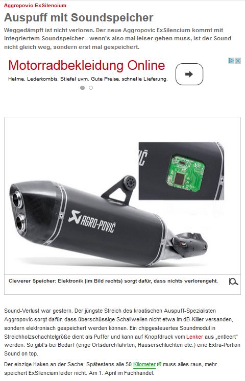 laut ÖRMEC (Öffentlich Rechtlichem Motorrad Experten Club) wird die Schräglage beim Motorradfahren ab sofort verboten. Hintergund sei die Gefährdung des Gegenverkehrs in Kurven. Weiterhin haben sich Anwohner von stark befahrenen Kurven über die unterschiedlichen Kurvenstile und mangelnde Einhaltung der perfekten Linie beschwert,"... wie sieht das aus wenn jeder anders durch die Kurve fährt?..." Auch der Funkenflug beim Rastenschleifen erinnere die Anwohner an Silvester und Sie werden verwirrt... ![]()