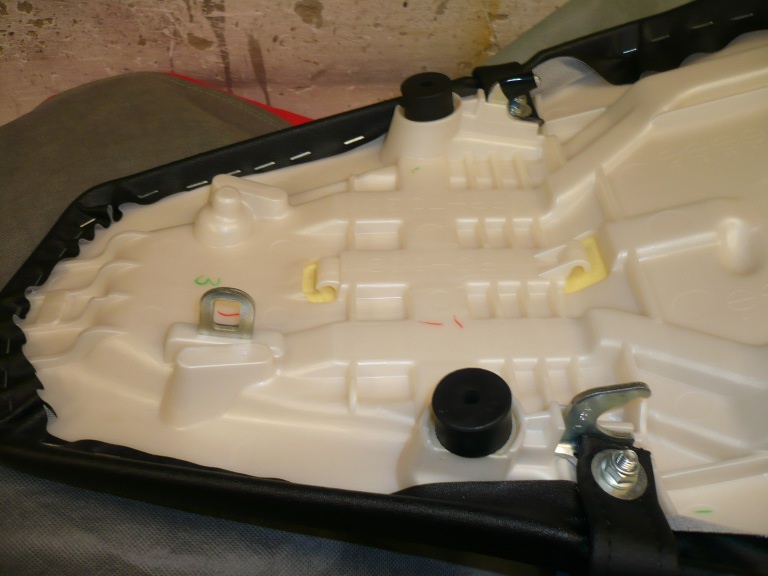 Resultat: Sitzbank weist rechts und links das gleiche (geringere) Höhenspiel auf, wirkt wertiger und reibt dadurch auch weniger vorn am Tank.