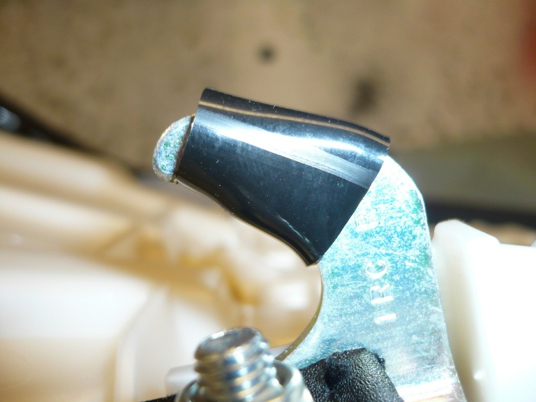 Ich habe ein Stück weichen PVC-Schlauch (innen 7, außen 10mm) über den rechten Führungshaken geschoben, gerade so, daß die Spitze des Hakens noch rausschaut, so sichert sich der Schlauch selbst vor herunterrutschen.