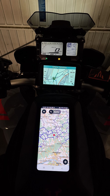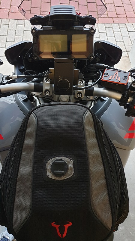 Sollte ich Navi UND Smartphone gleichzeitig in Gebrauch haben, habe ich auf dem Tankrucksack noch mal die gleiche Halterung und kann das Smartphone darauf befestigen.