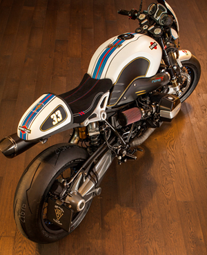 Er baut auf Kundenwunsch BMW und Klassiker um. Dort stand eine BMW ninet mit Seitenkennzeichenhalter.