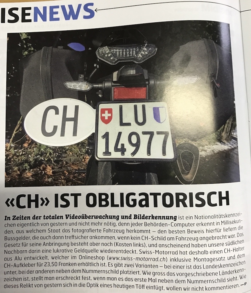 Für meine MT habe ich mir aus einem Kunststoffbenzinkanister ein Rechteck ausgeschnitten mit einem grossen CH Kleber versehen und an einer verlängerten Mutter des Rückstrahlers ein Gewinde geschnitten damit ich mit einer Rändelmutter ohne Werkzeug das Plastikschild hinter dem Kennzeichen herunterklappen und wieder verstauen kann. Das hat auch noch den Nebeneffekt, dass bei Regenfahrt ein zusätzlicher Spritzschutz vorhanden ist und bei allen übrigen Fahrten sieht man das Teil praktisch nicht. Damit der Plastik beim Einfedern nicht am Reifen scheuert, hält ihn eine Blattfeder etwas flacher nach hinten. Das ganze kostet weniger als Fr.10.00