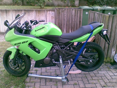 #66 die Höhe kann man mit der Position der Stange verstellen.ich stelle immer ziemlich tief weil das Motorrad dann weniger Kopflastig ist.zum Vorderrad entlasten benutze ich Spanngurte oder einen Wagenheber.rechts braucht es eine 19er Stecknuß und links eine Polyamidbuchse wo in das obere Loch des vorderen Fußrastenhalters gesteckt wird.Buchse kann man bei Becker für kleines Geld beziehen oder selbst drehen.