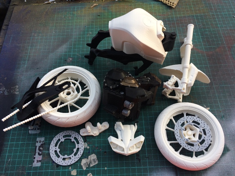 Da die Bremshebel und die kühlrippen der Scheinwerfer aufgrund der Größe nix geworden sind fange ich nochmal ganz von vorne an. Diesmal in 1:4 und hochauflösend, auch wenn’s lange dauert. Nach 20h sind zumindest Gabel und Lenker fertig...