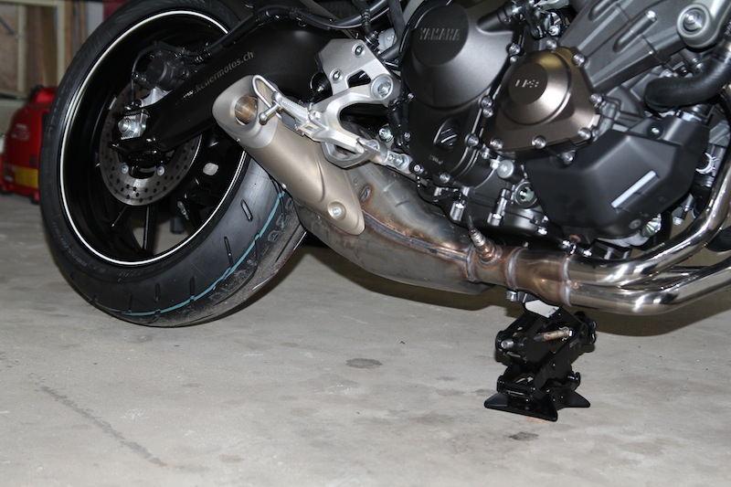 Für den Vorderradausbau den Wagenheber vorne am untersten Auspuffrohr ansetzen. (natürlich mit Kratzschutz)