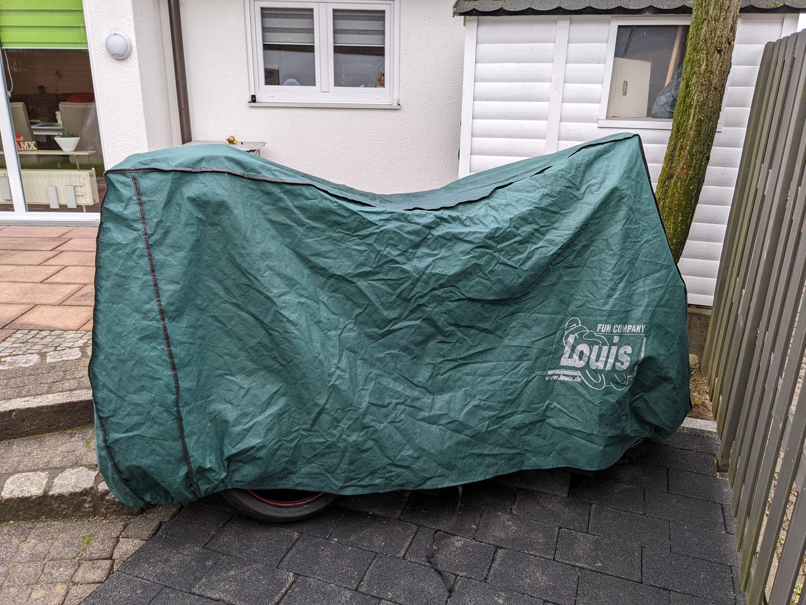 - schweres Material (weht nicht davon und fällt quasi von allein über das Mopped)