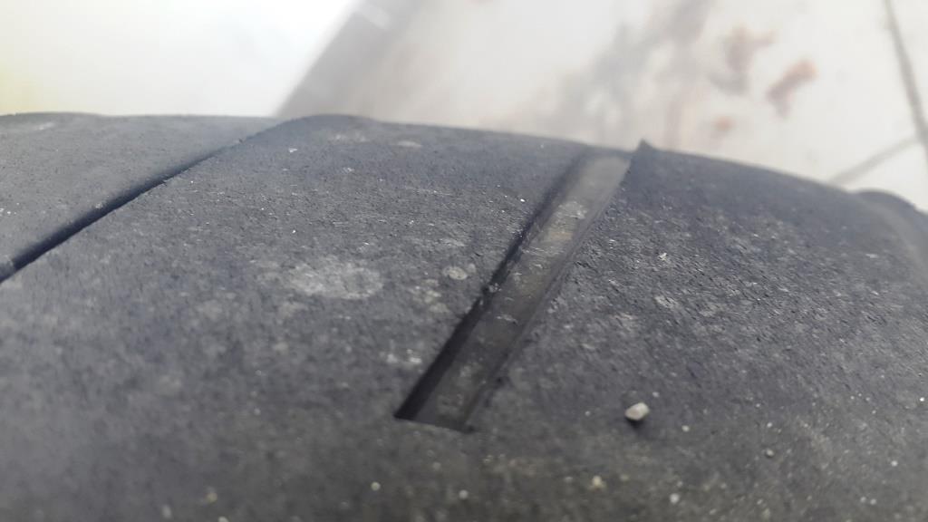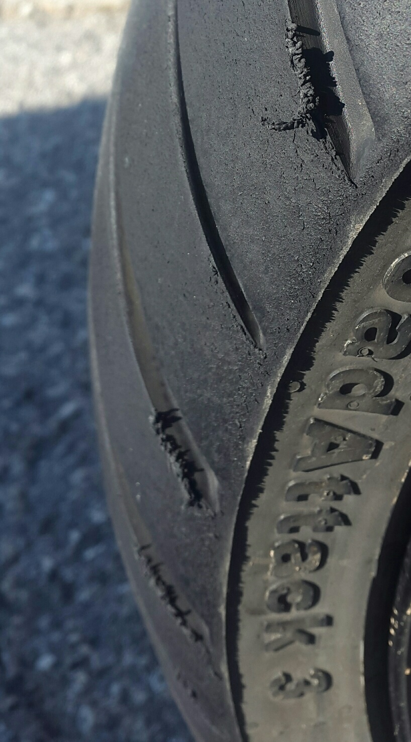 Das Verschleißbild des Hinterreifens am Ende der Laufleistung ist außergewöhnlich (sieht nach wenig Zugstufe aus), obwohl das Federbein meiner Meinung nach gut eingestellt ist. Dieses deckt sich auch mit Erfahrungen anderer Fahrer und ist wahrscheinlich eine Eigenart des Reifens.