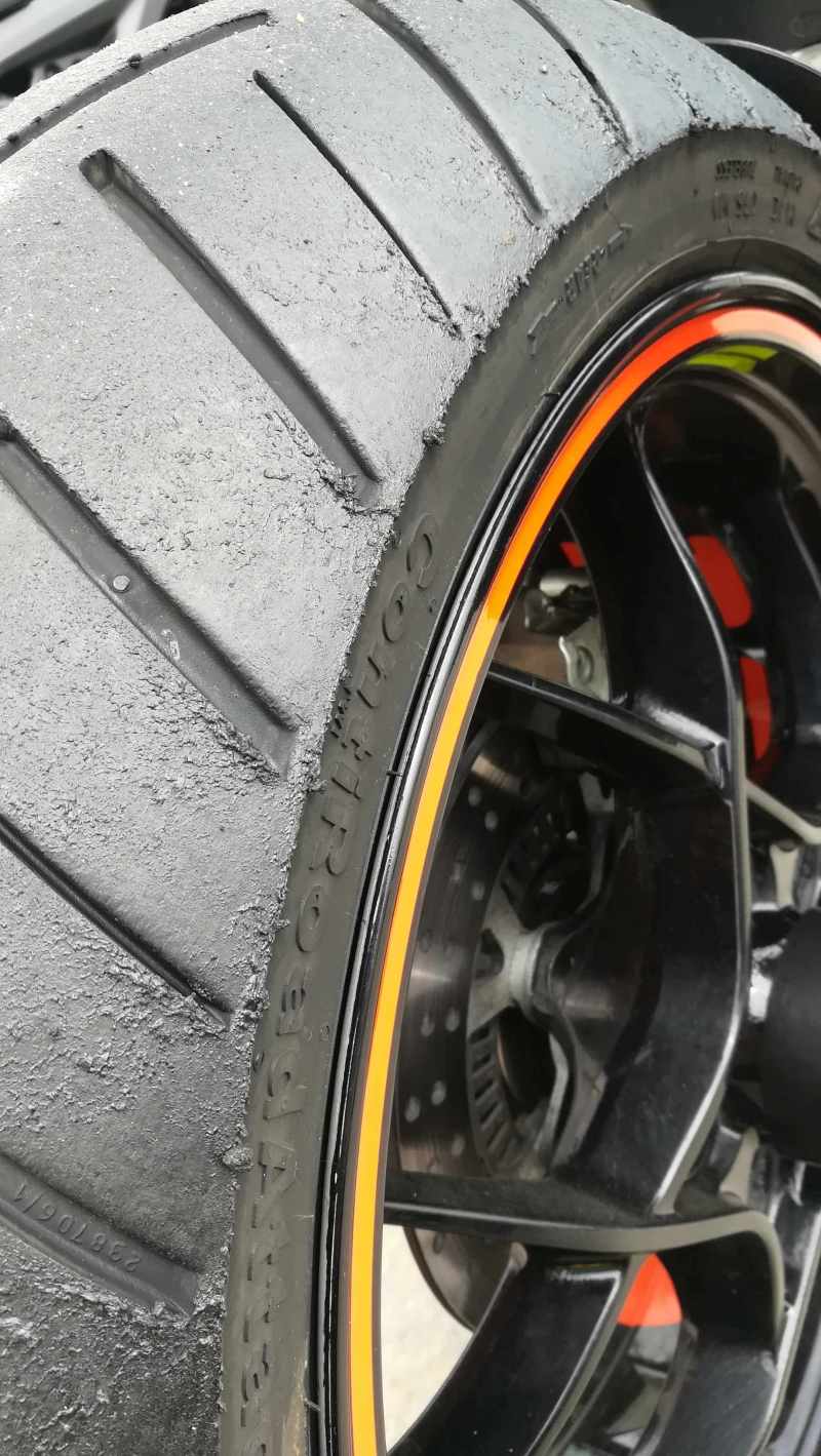 Das Reifenbild wie bei Rolf D kommt bei etwas ruhigerer Fahrt zusammen, sah bei meiner Liebsten auch etwa so aus, da ist der Reifen schön warm um klebrig zu sein und sammelt den ganzen Gummi von der Strecke ein. Das wird man so im normalen Straßenverkehr nicht finden und nach einer kleinen Runde auf "normaler" Straße ist dieses Reifenbild auch schnell wieder geglättet, weil sich der gesammelte Gummi sofort wieder abfährt.