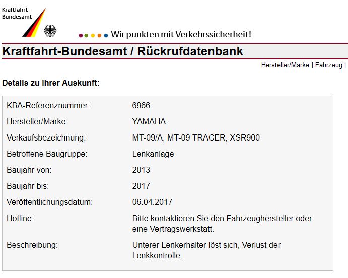 Rückruf MT 09 (inkl Tracer) / Lenkerhalter