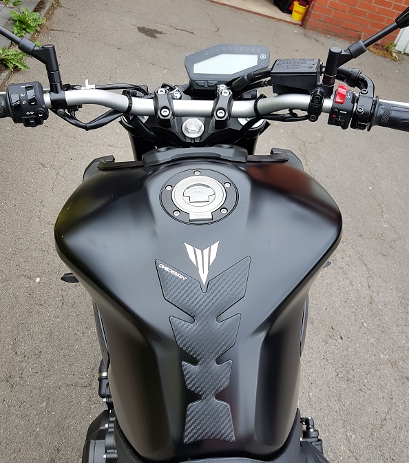 Hätte man durchaus weiter oben - zum Logo hin - ankleben können. Ich finde es so allerdings fast am besten. Hätte ich das gleiche Tankpad, würde ich es auch so weit unten ankleben, weil ich mit dem Hosenschritt häufig am Tank ankomme (so weit vorne sitze ich). Was bringt das Pad, wenn ich es nicht da anklebe, wo es schützen soll?