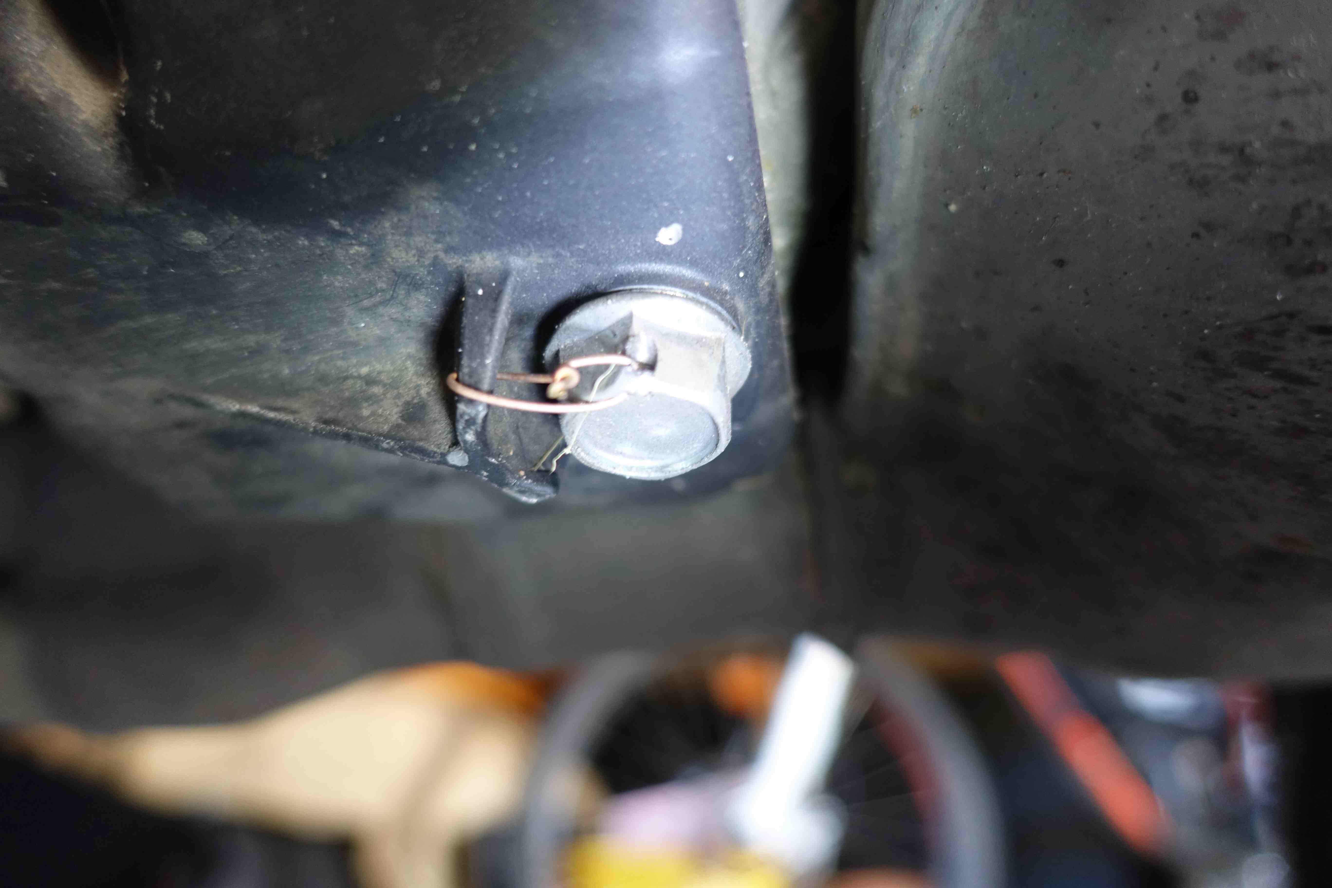 Die neue Schraube ist nun mit Draht gegen Aufdrehen gesichert.