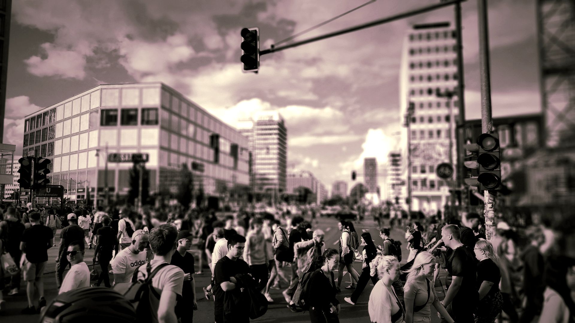 Chaotisches Gewusel, als eine Horde Fußgänger die Straße überqueren, nachdem die Ampel auf grün geschaltet hat.