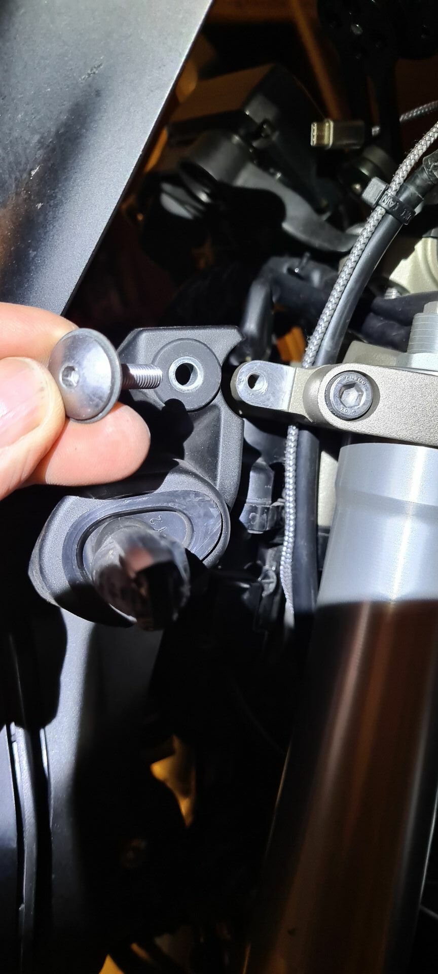 Zwei Schrauben Imbus (Torx geht auch) oberhalb der Blinker lösen: