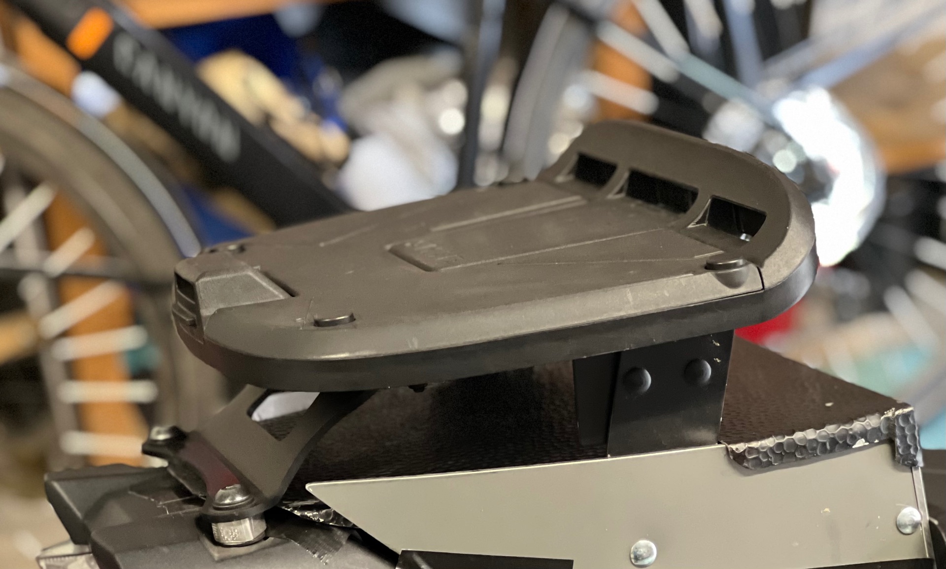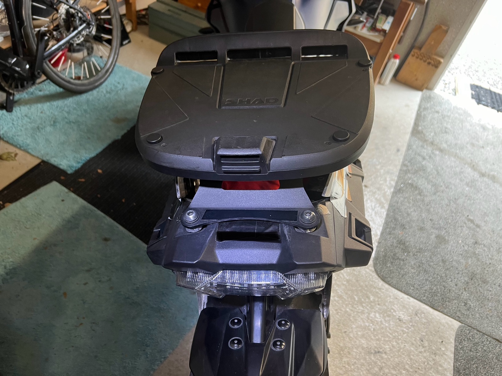 Beim Aufsteigen hebe ich das Bein ( Fuß voraus) über die Fahrersitzbank, ein schwungvoller Aufstieg wie ein 1,94 Riese gelingt mir sowieso nicht 😢. Aber durch die Drehung der Platte nach vorne, ist das Topcase kaum zu merken und das Moped wird keinen Zentimeter länger.