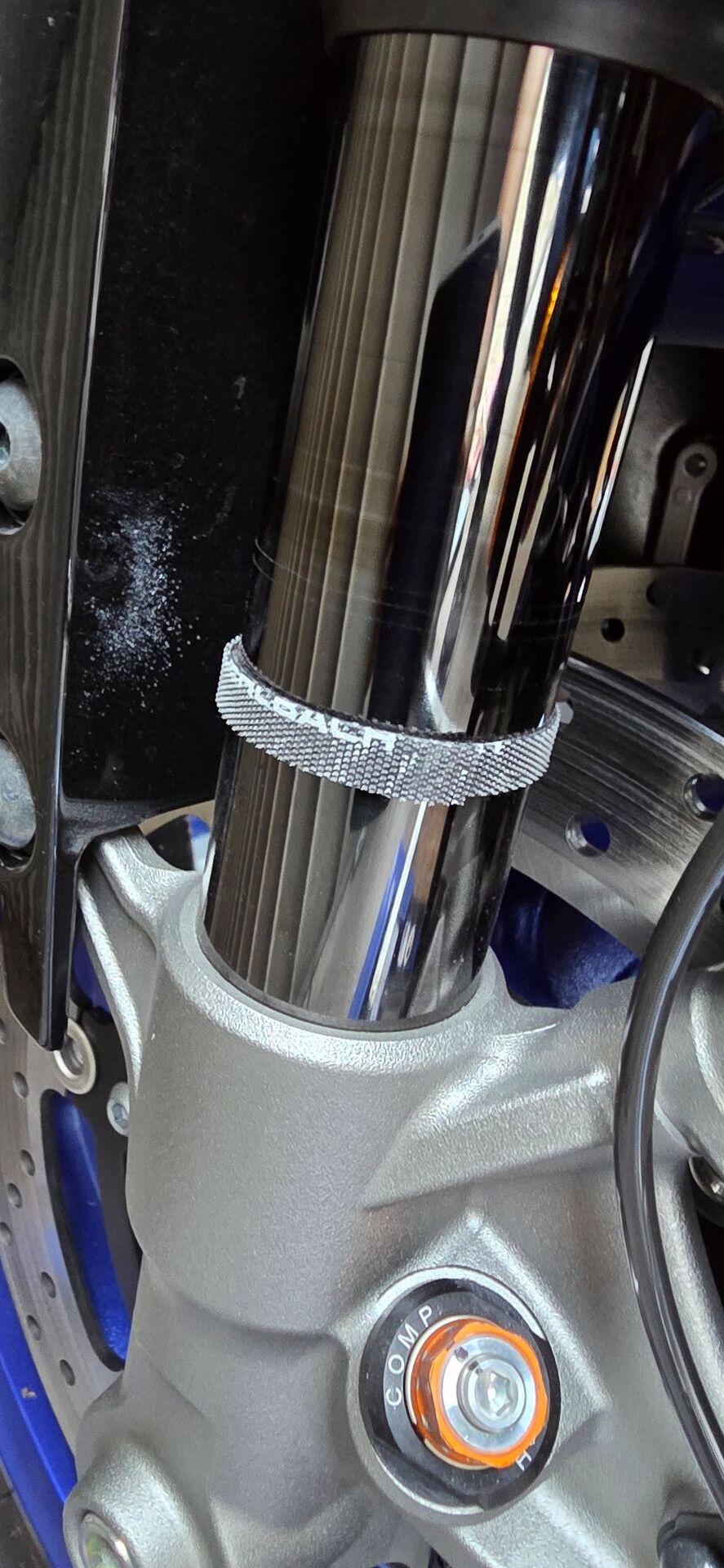 Genutzt habe ich Klettstreifen für Kabel. Innen sind diese Streifen nicht so hart wie Kabelbinder. War mir irgendwie schonender für die Lauffläche. Sollte die Testphase durch sein, kommen die wieder ab. Ein Schmirgelpapier möchte ich nicht an der Gabel haben.