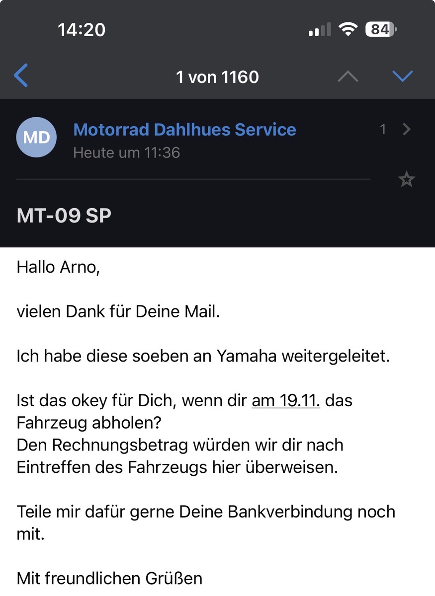Heute am 06.11.25 habe ich eine Rückabwicklung des Kaufvertrages bei Yamaha über meinen Händler eingereicht. Yamaha hat es nicht nötig bis heute eine Rückantwort zum Ereignis vom 17.08. zu geben. Still ruht der See trotz mehrmaliger Nachfrage meinerseits - immer über den Händler.