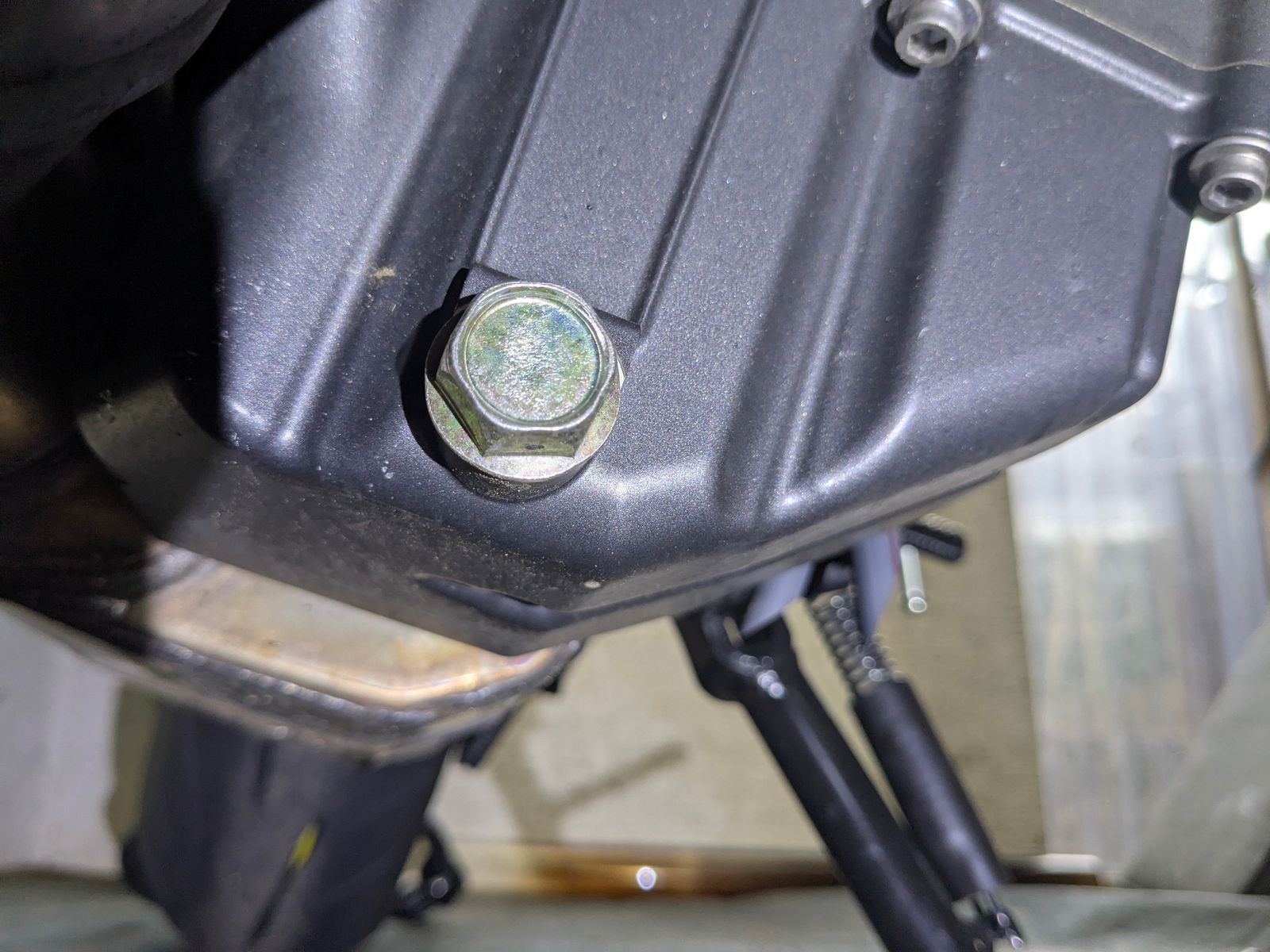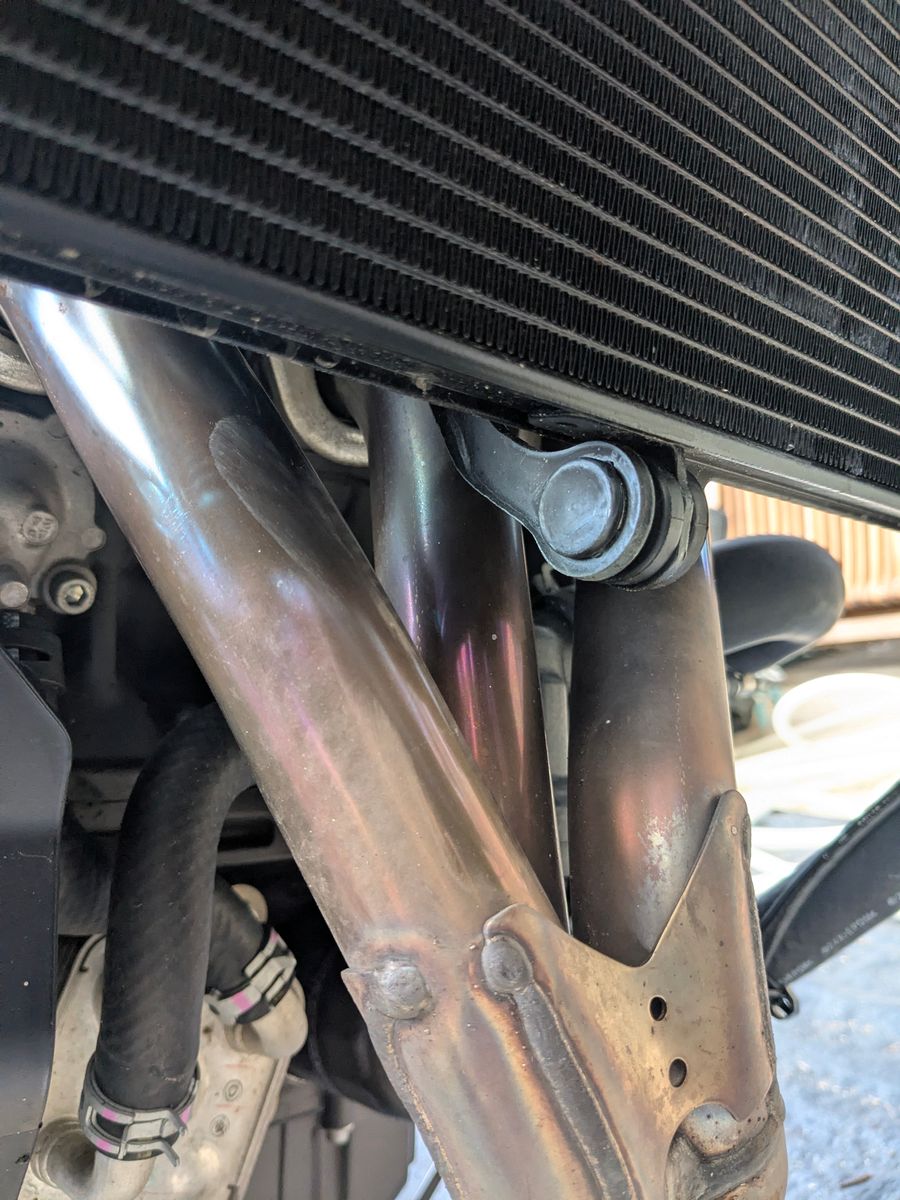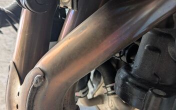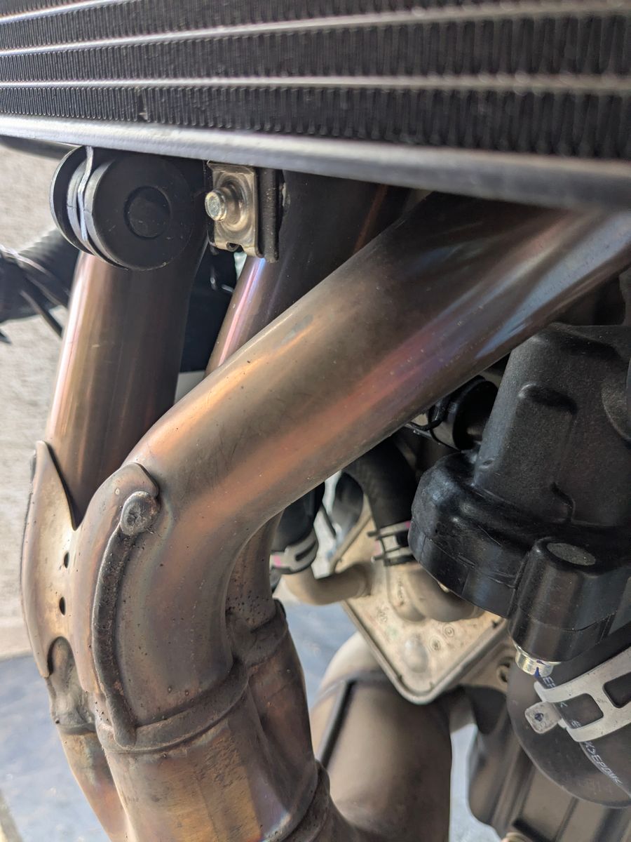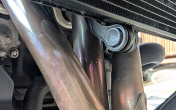 Habe sie einmal für 5 Minuten im Leerlauf laufen lassen, um nach dem Öl zu schauen. Schaum sehe ich da nicht viel, aber für 400 km Laufleistung ist das Öl schon etwas dunkel.öl Ablassschraube ist auch nicht angefasst worden.Ich habe auch noch zwei Bilder vom Krümmer gemacht – schaut mal bitte drüber, ob die Blaufärbung für die Laufleistung okay ist oder ob sie ordentlich getreten wurde.Zumindest von der Länge her ist die verfárbung nicht krass.Da fehlt mir leider ein Vergleich.