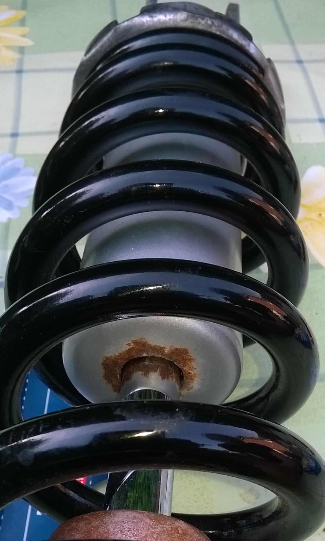 Habe nun auch endlich auf Wilbers umgerüstet. Vorne progr. Federn und hinten das 641er Federbein. Erste Fahrt mit neuem Fahrwerk und ich hatte ein ganz neues Motorrad. Ärgere mich, dass ich die ersten 17 tkm mit dem Originalschrott unterwegs war. Hier noch ein Bild des Originalfederbeins nach 4 Jahren. Das ist mehr als Flugrost. Noch 2 Jahre und Ding fliegt dir um Ohren.