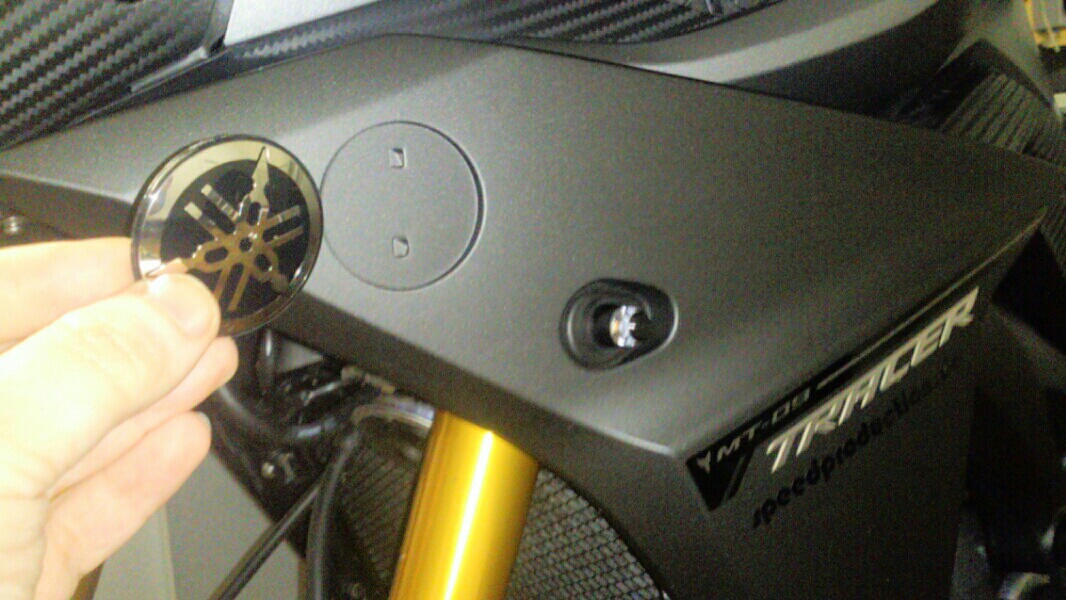 Gestern beim Putzen (Katzenwäsche) ist mir aufgefallen das das linke Yamaha Emblem seltsam vorstand, kurz angepiddelt und ich hatte das Teil in der Hand.