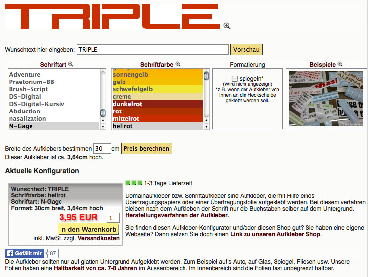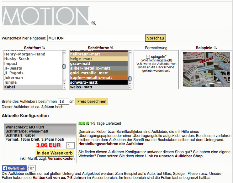 http://www.dpi-aufkleber-shop.…eber_selbst_erstellen.phpHier ein Beispiel für einen Teilschriftzug in 30 cm Breite in Rot (ca. 4 €/Stck. zzgl. Versand) und den Ergänzungsschriftzug in weiß (ca. 3 €):