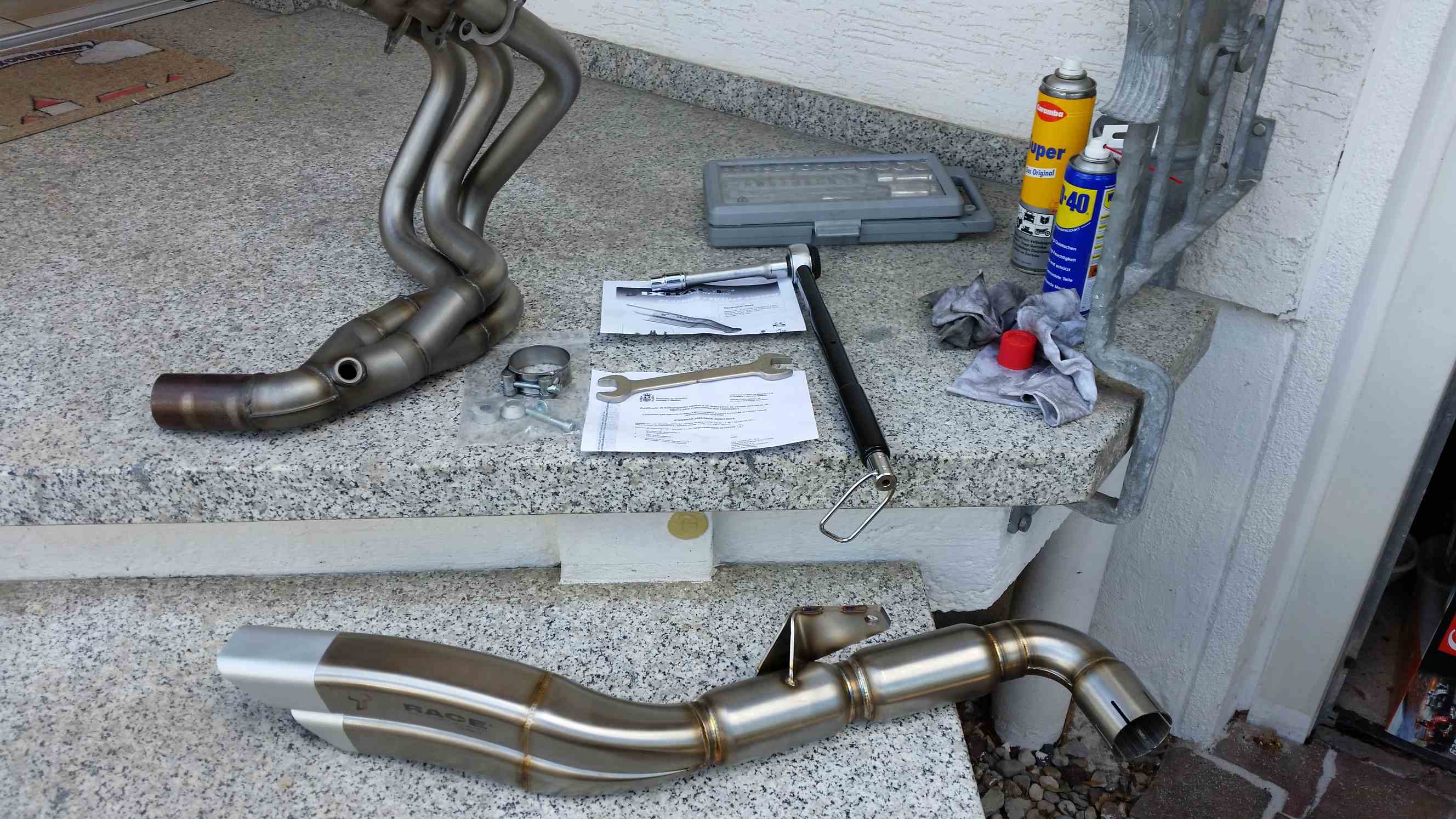 4. Nun ging's los. Was braucht man? Ratsche mit 12Nuss für die 6 Krümmer-Schrauben. (Verlängerung!) und einen 20er Maulschlüssel für die Lambdasonde. Tja, und noch einen Imbus (7er?) weiß nicht mehr, um die Topf-Halterung zu montieren, die nicht wie der original befestigt wird. Wie es geht, muss man sich selber zusammenreimen, da leider keine Anleitung beilag, aber das war auch nicht zu kompliziert.Insgesamt hab ich ca. 30-40Min als Ahnungsloser gebraucht. Man muss beachten, dass die Krümmer anders gebogen sind, so dass es tricky ist, an die linke Schraube der mittleren Schelle zu kommen...