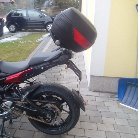 Das Ist meine Interpretation einer Topcasehalterung über Soziussitz habe einen Klappmechanismus eingebaut um noch zu Werkzeug zu gelangen muss nur noch Pulverbeschichtet werden