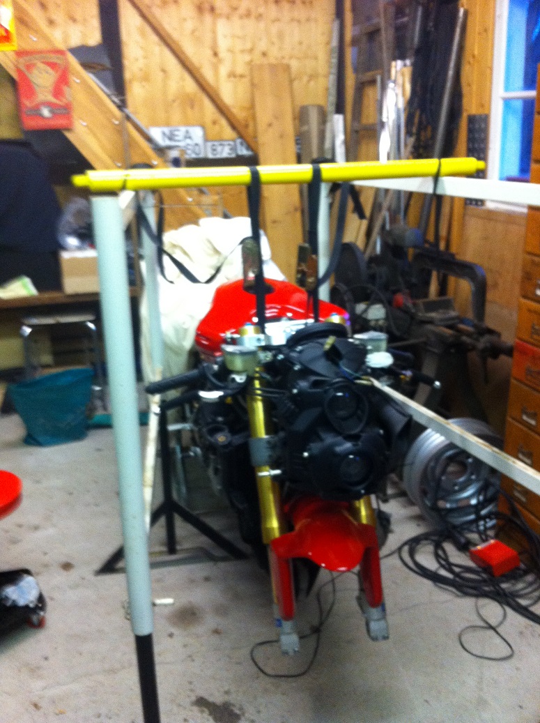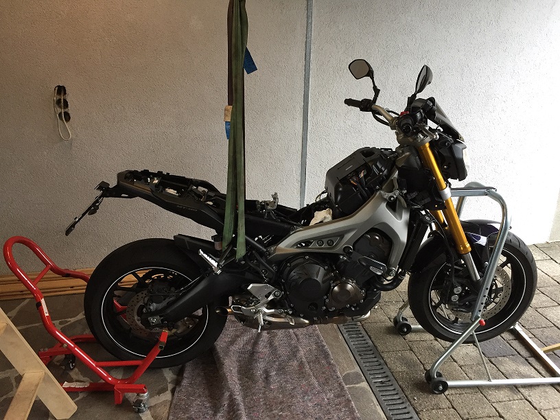 Die Schlüpfe hängen an einem Elektrokran im Carportgiebel, früher habe ich einfach zwei Schwerlastböcke links und rechts neben das Motorrad gestellt , Eisenrohr darüber- gesichert, und dann mit Ratschenspanngurten hochgezogen, funktioniert vorne wie hinten.Gruß, Wolfgang